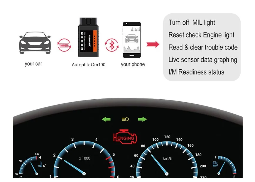 1) Читает диагностические коды неисправностей, как общие, так и конкретные производители, и отображает их значение (более 3000 определения универсальных кодов в базе данных).