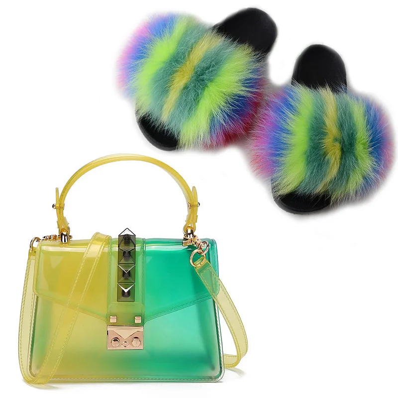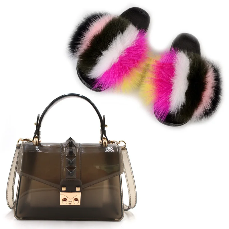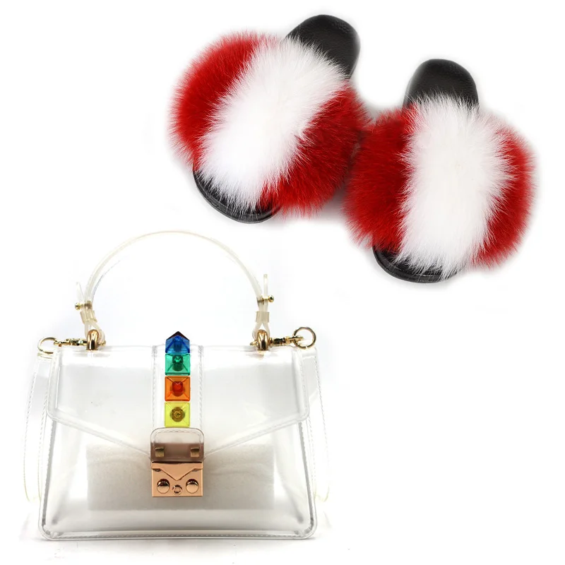 Женская обувь; Летние новые тапочки из лисьего меха; Женские меховые тапочки; Новые Модные прозрачные женские шлепанцы с заклепками