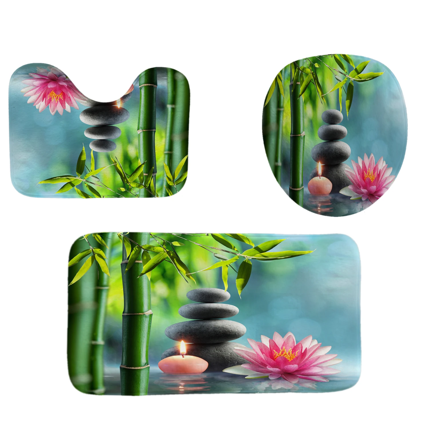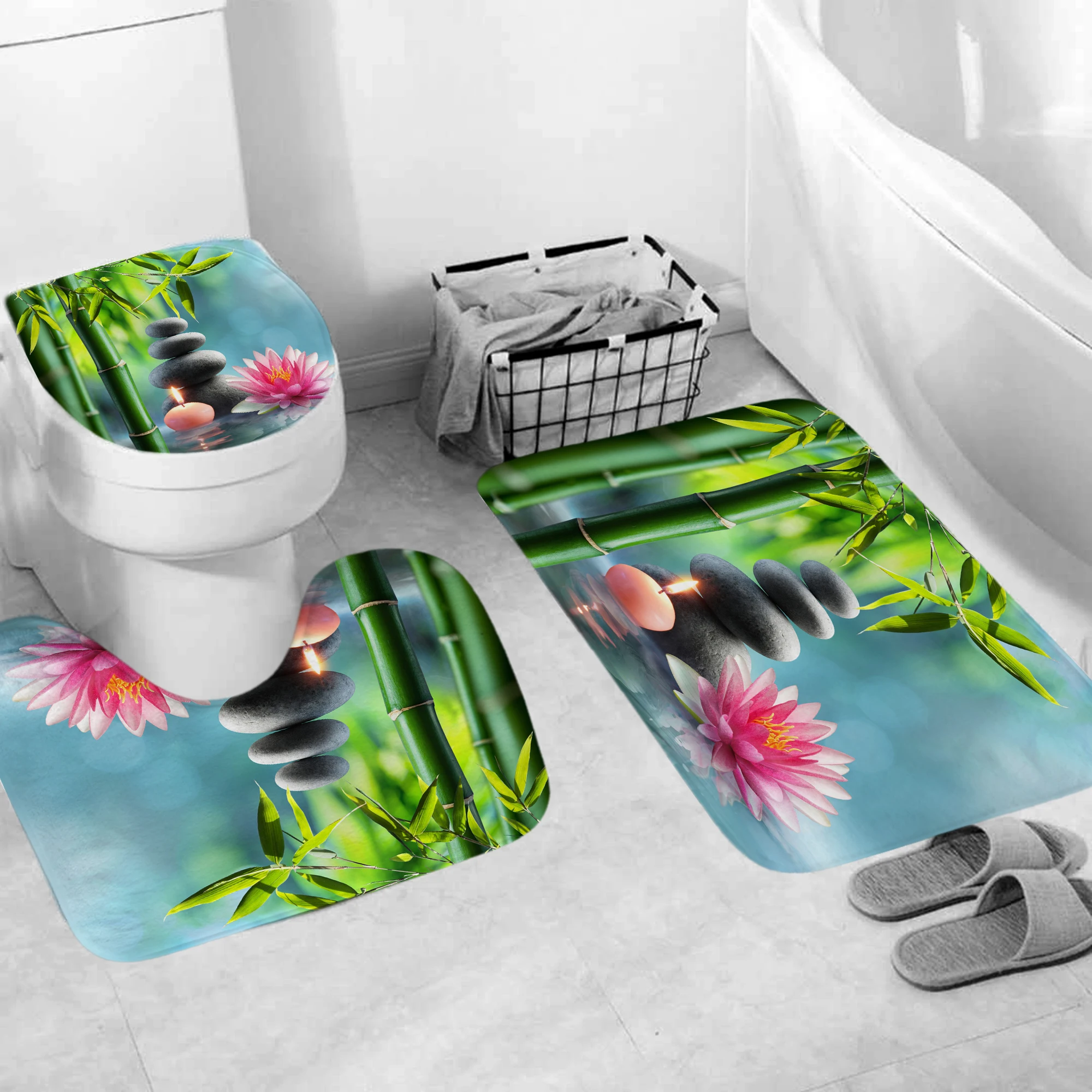 Занавеска в ванную комнату с листьями лотоса, Противоскользящий ков...