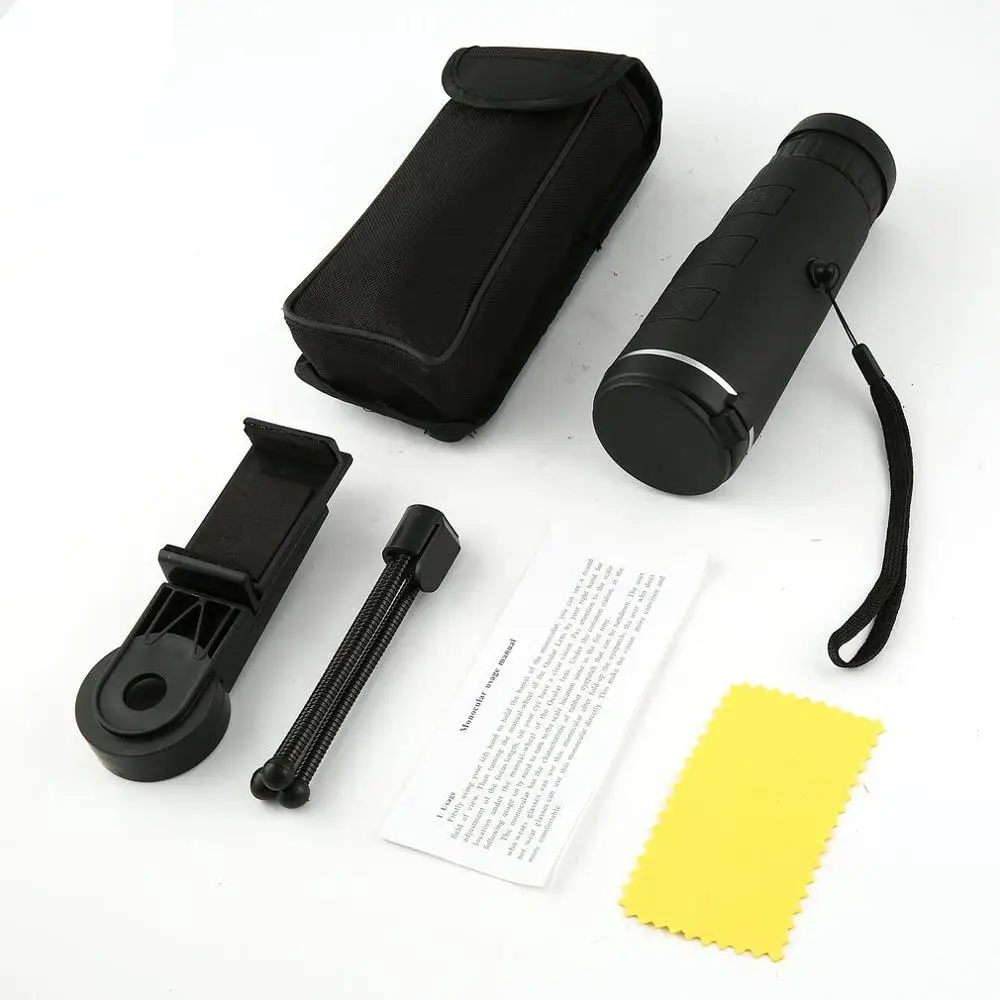 Особенности: Монокуляр HD vision, увеличение 40 x с дизайном объектива BAK4 prism, дает вам более четкие и красочные пейзажи. Легко фокусируется, его можно сложить, чтобы соответствовать расстоянию ваших глаз, подходит как для взрослых, так и для детей. Многослойная Улучшенная зеленая пленка FMC увеличивает передачу света для более ярких и контрастных изображений. Это поможет вам увидеть вещи при низком освещении, это не поможет вам увидеть вещи в темноте. С компасом на монокуляре, никогда не нужно беспокоиться, что вы можете быть потеряны в поездке. Оснащен штативом и зажимом для телефона, чтобы увидеть более красивый вид через телефон. Описание: Резиновое покрытие защищает корпус от ударов и износа, прочное в использовании. Самое дальнее визуальное расстояние может достигать 9500 м, оно в 20 раз больше, чем у других обычных камер. Легкий и компактный, легкий и удобный для использования на открытом воздухе. Характеристики: Тип: широкий зажим, небольшой зажим Модель: 40X60 Увеличение: 40 x Диаметр объектива: 52 мм Диаметр окуляра: 22 мм Диаметр выходного зрачка: 3 мм Расстояние рельефа глаза: 14 мм Поле зрения: 1500/9500 м Длина: 15 см/5,91 дюйма Тип призмы: BAK4 Оптическое покрытие: полностью многослойная FMC зеленая пленка Система фокусировки: Центральный индивидуальный фокус Размер телескопа: около 155x50мм Цвет: черный В комплект входит: Монокулярный телескоп 40X60-1 шт. 1 x зажим для телефона 1 х Ткань для объектива Штатив-1 шт. Пылезащитный чехол-1 шт. 1 x слинг, 1 x чехол
