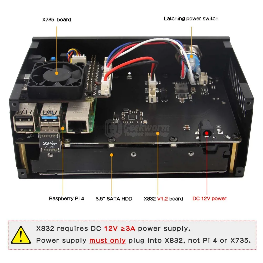 Источник питания:12Vdc +/-5% , ≥ 3A(Пожалуйста, включите питание через порт X832' DC! Не включайте питание через X735 или pi 4)