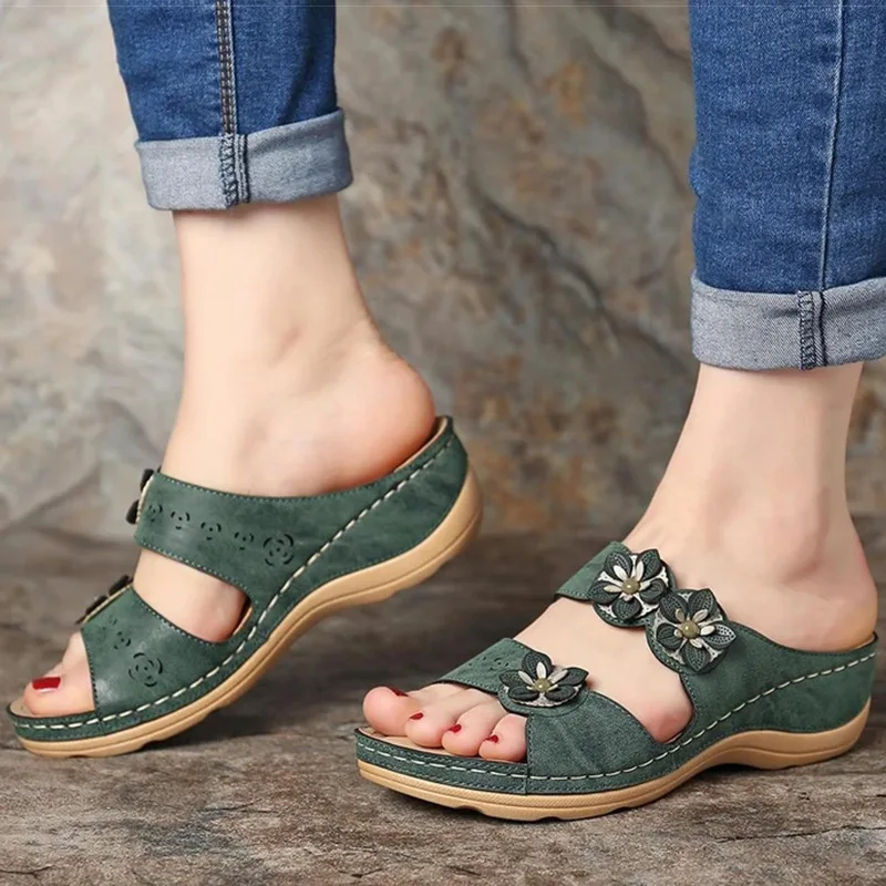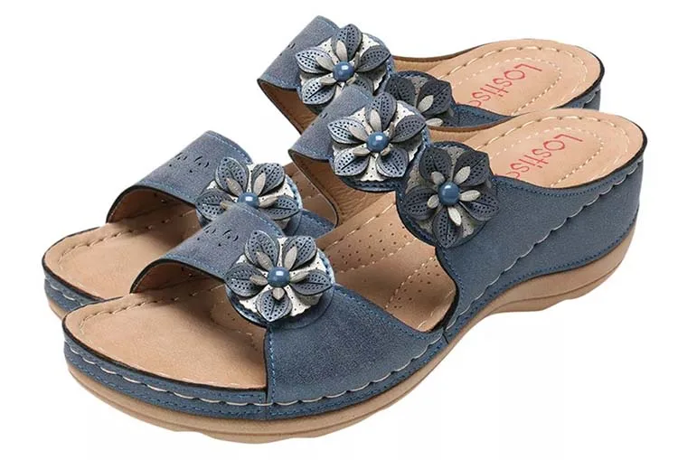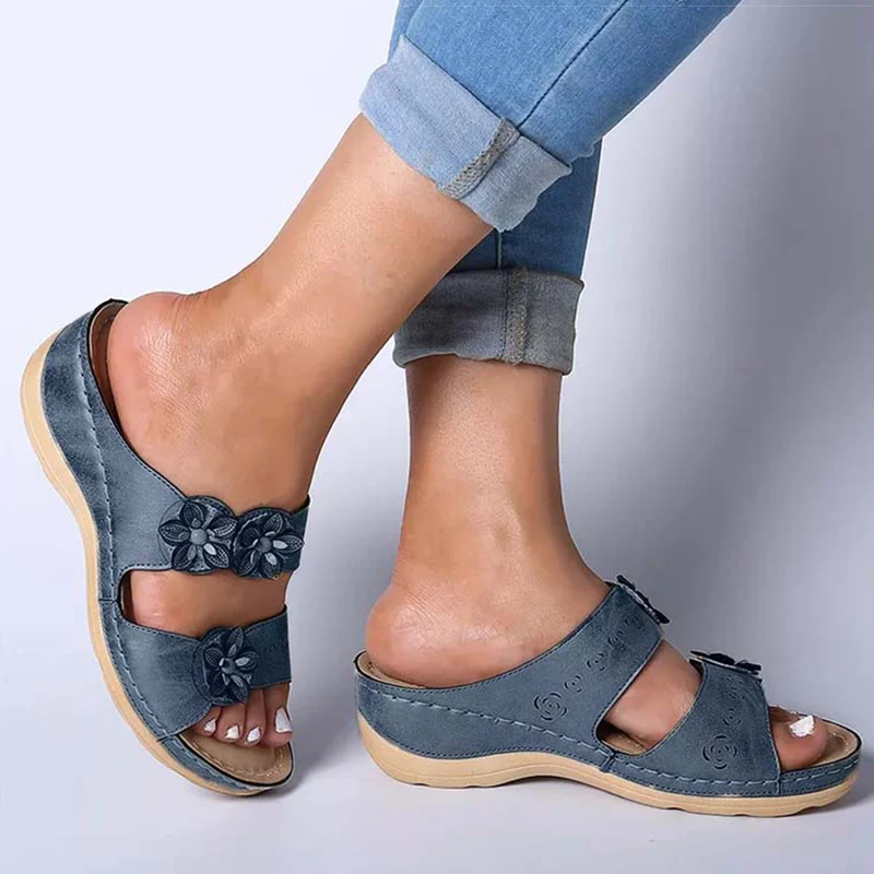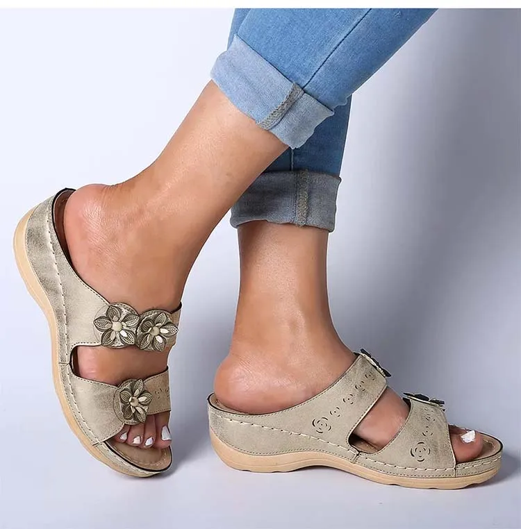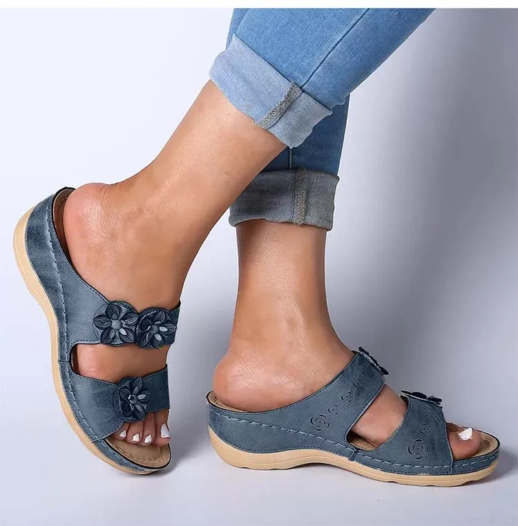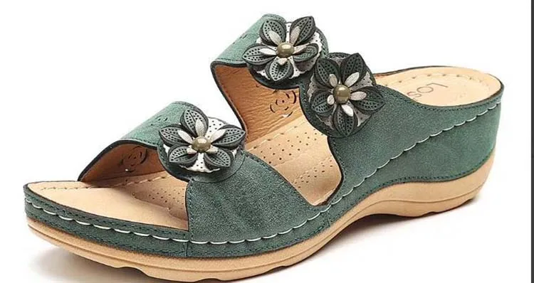 Женские босоножки на низком каблуке, повседневная обувь на танкетке для женщин, Летние Босоножки с открытым носком, пляжные босоножки с цветами, размера плюс, 42 шлепанцы