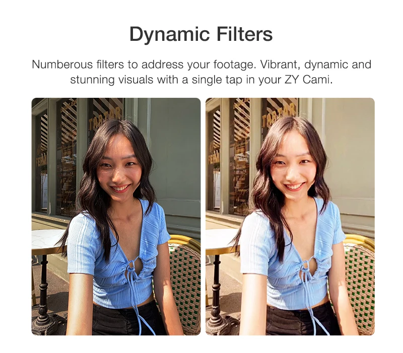 Большой выбор фильтров для снятого видео. Создавайте реалистичные, динамичные и невероятно красивые видеоэффекты одним касанием в приложении ZY Cami.