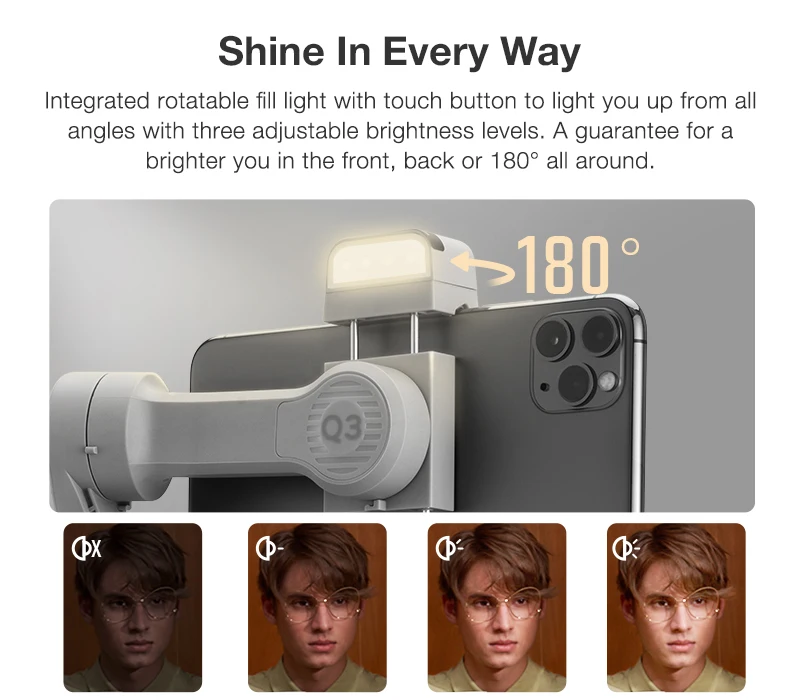 Встроенный поворотный источник заполняющего света с сенсорной кнопкой управления и тремя уровнями яркости поможет осветить сцену с любого угла. Добавляйте яркость где угодно: спереди, сзади или со всех сторон в пределах 180°.