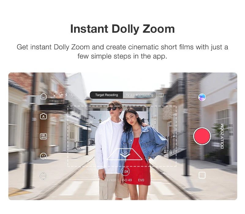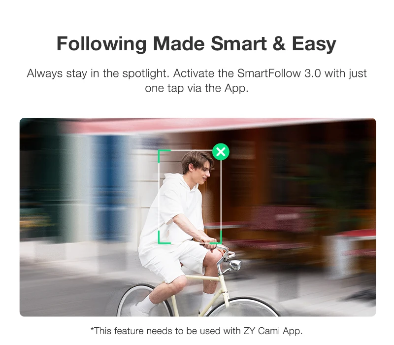 "Теперь важное всегда будет в центре кадра. Активируйте функцию SmartFollow 3.0 одним касанием в приложении. * Эта функция доступна только при использовании приложения ZY Cami."