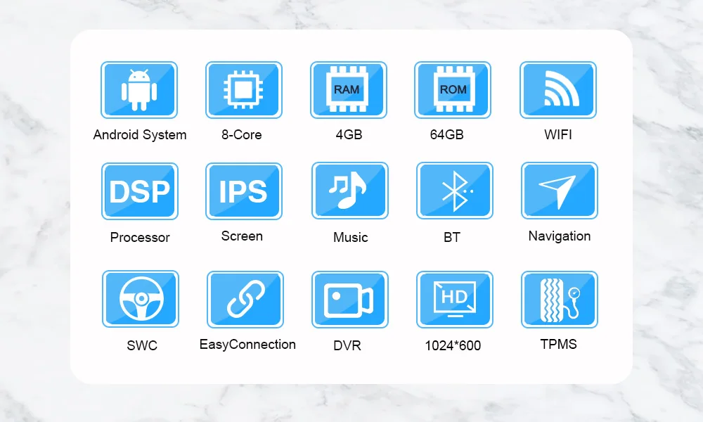 GPS + FM/AM радио + RDS + Bluetooth + USB + SWC + Встроенный Wi-Fi + Встроенный видеорегистратор с поддержкой OBD/3G
