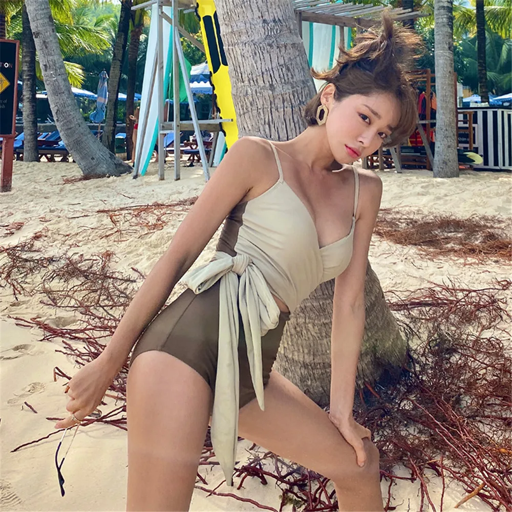 Цельный купальник в Корейском стиле, Женская однотонная одежда для ...