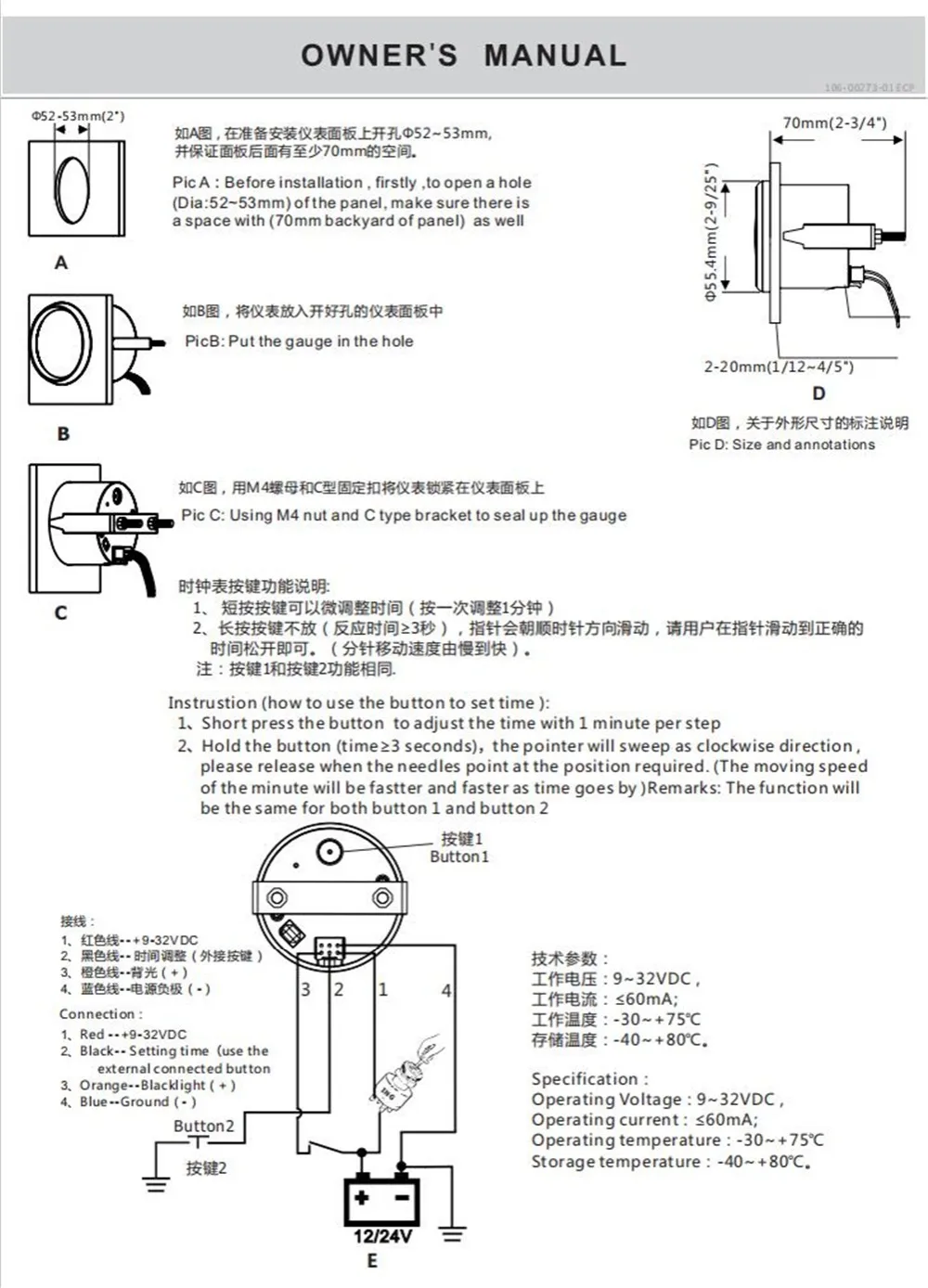 Диаметр установки: Φ52мм или 2-1/16"