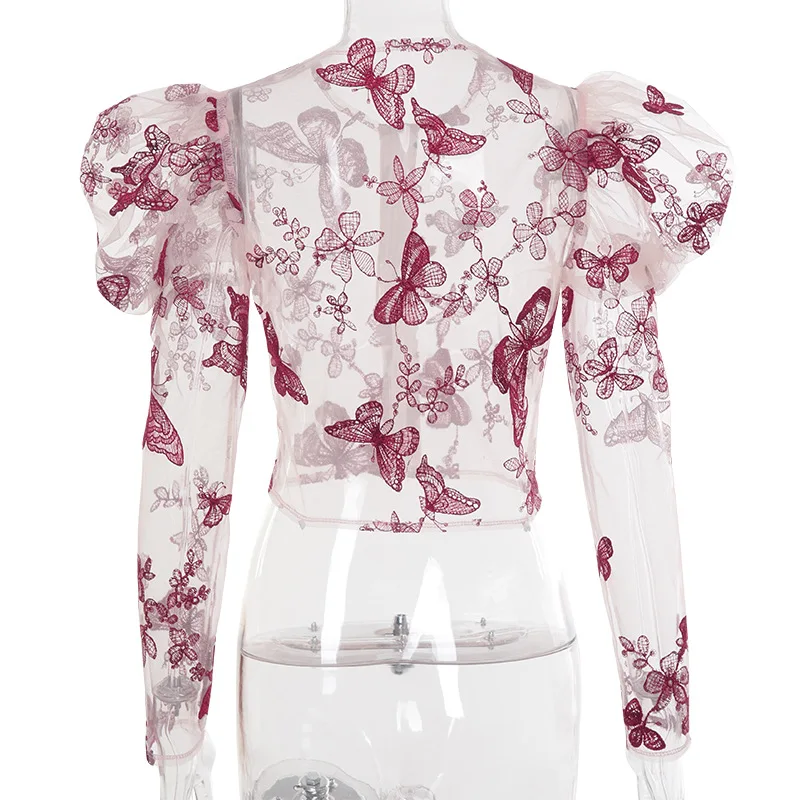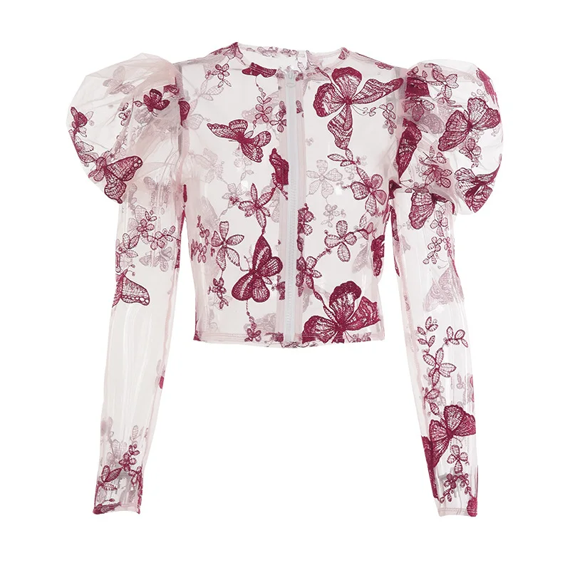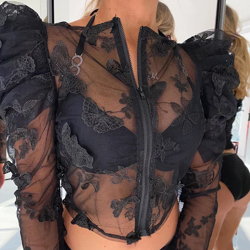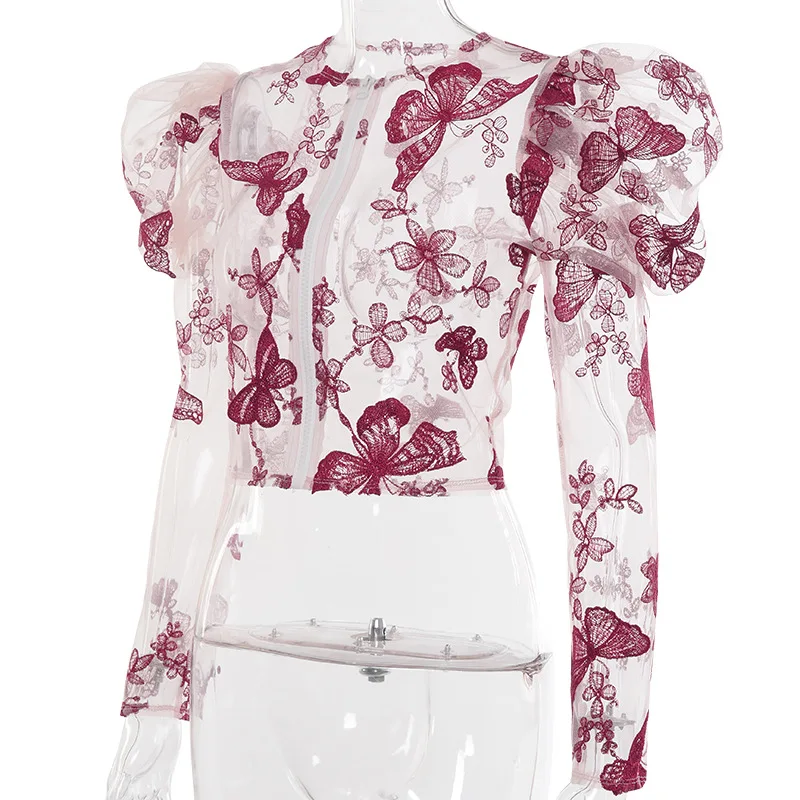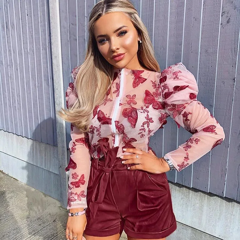 Женская блузка с длинным рукавом-фонариком, Прозрачная Клубная блузка с цветочным принтом и молнией, лето 2020