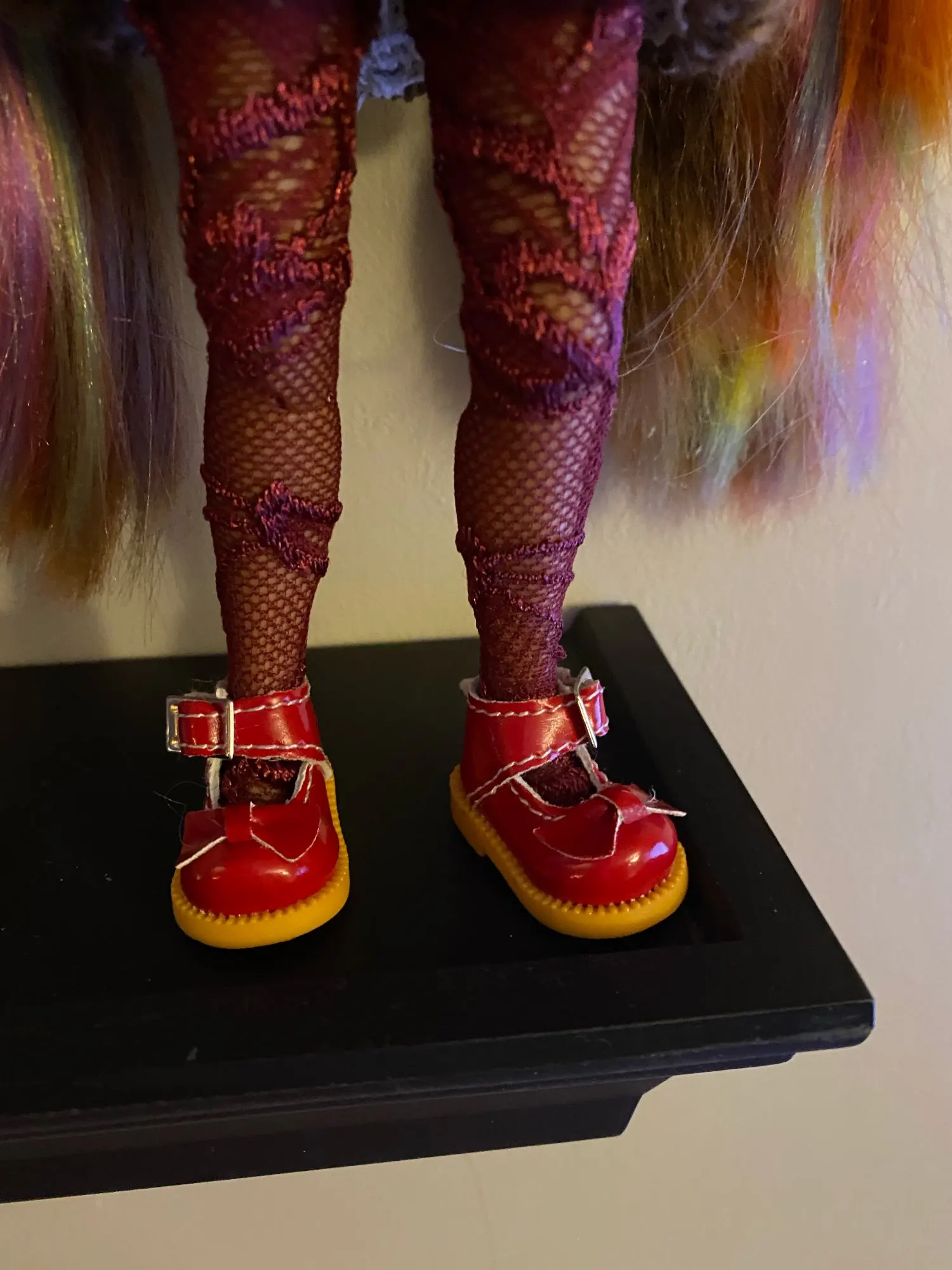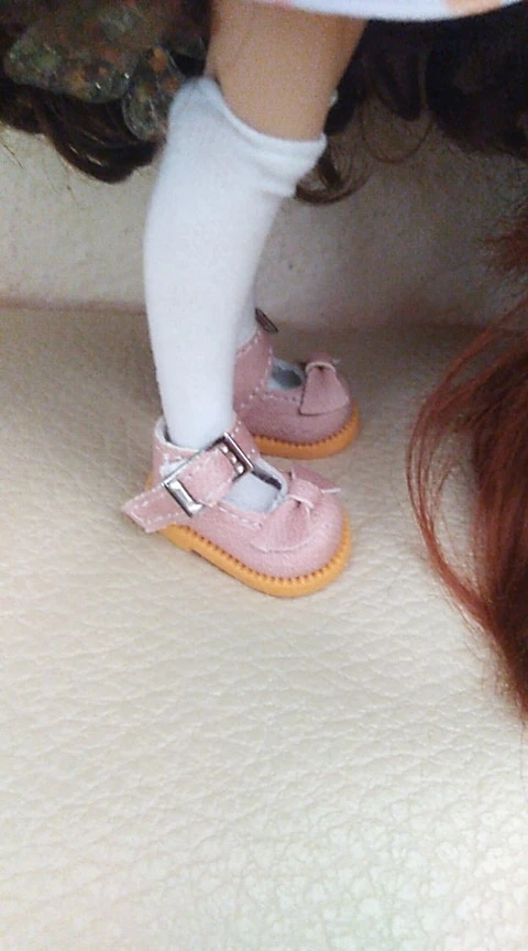 Они действительно подходят для Realfee и Dotories BB, как вы можете видеть на второй картинке. Я также примерила их на своем теле пурпурно-эмо (третья фотография, рядом с маленькой обувью, которая очень хорошо ей подходит) и, хотя они немного великоваты для нее, Я разрешил положить носки к кукле и максимально затянуть ремешок. Я доволен.