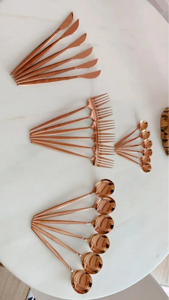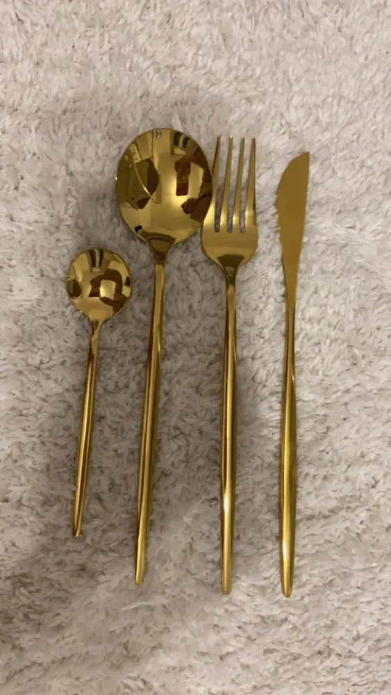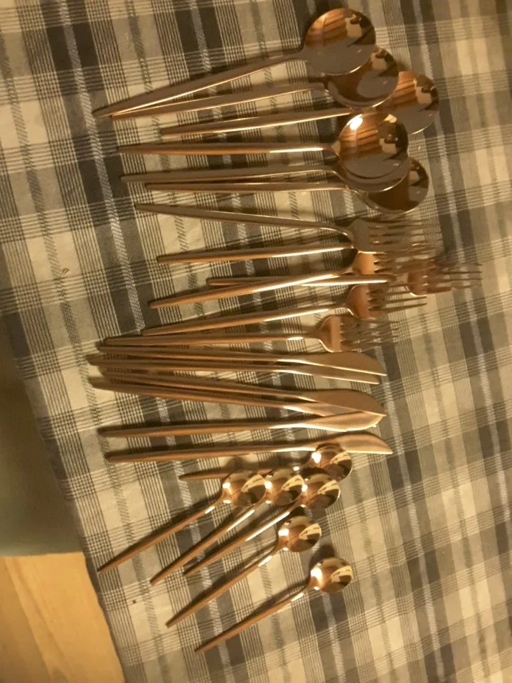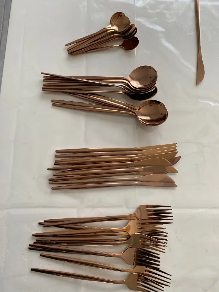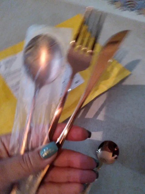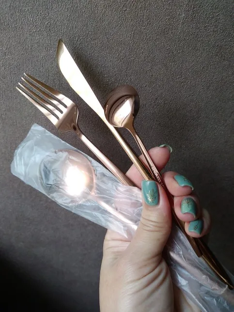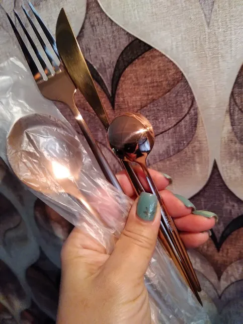 Очень красивые столовые приборы! Достаточно тяжеленькие. Ручка немного длиннее обычной, нож с небольшой режущей поверхностью, но справляется отлично! Цвет просто супер, такой благородный) Доставка быстрая, если учесть, что заказ был сделан 11.11. Было небольшое но, несколько приборов оказались поцарапанными, возможно при транспортировке. Продавец просто умничка, мы пообщались и решили этот вопрос. Заказом более чем довольна и вам рекомендую!