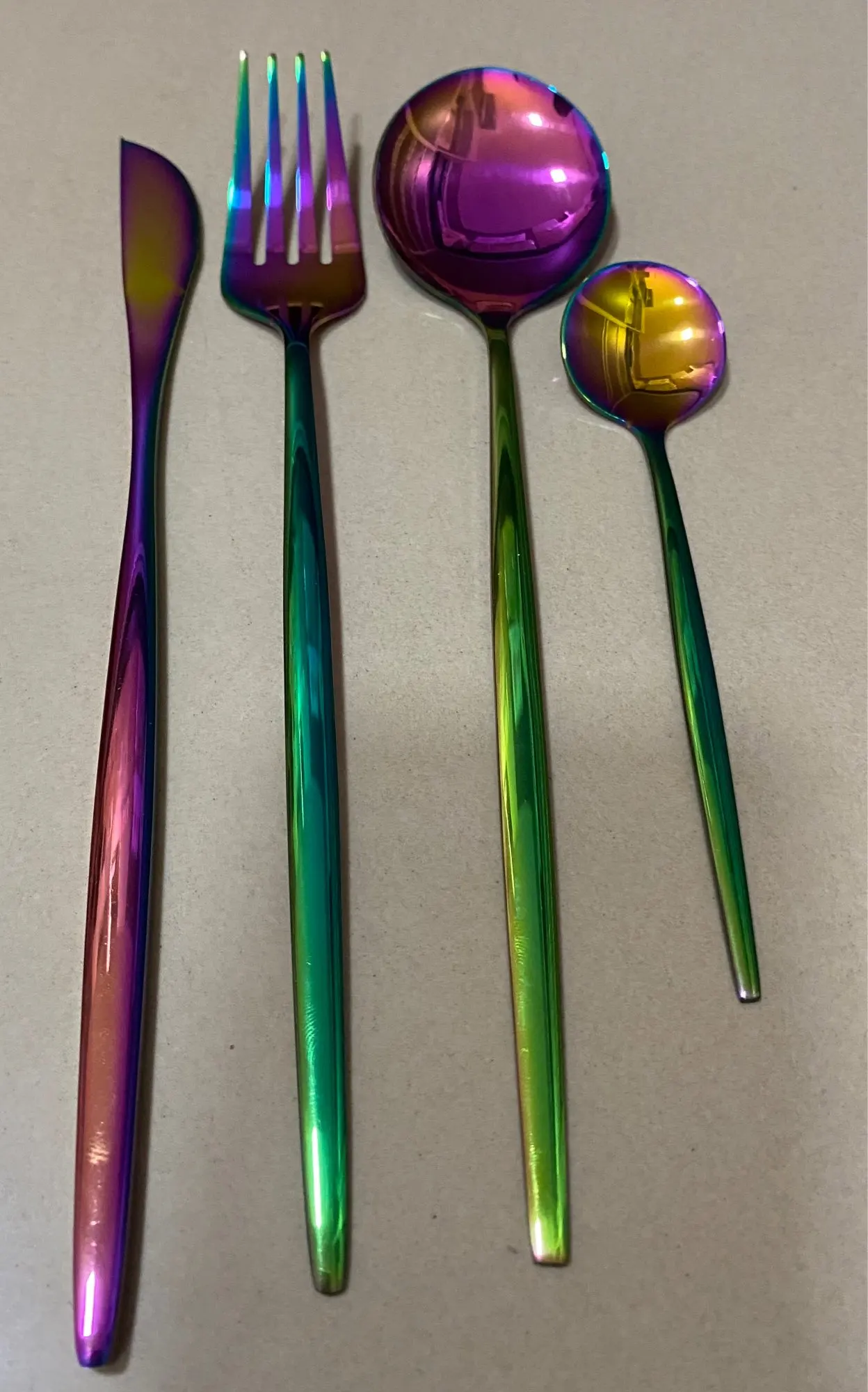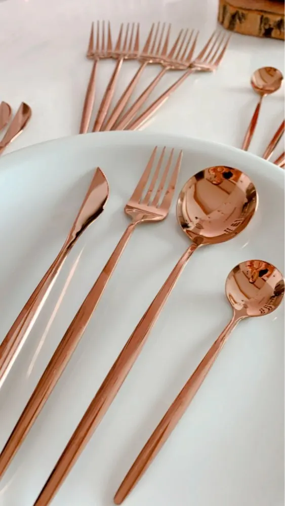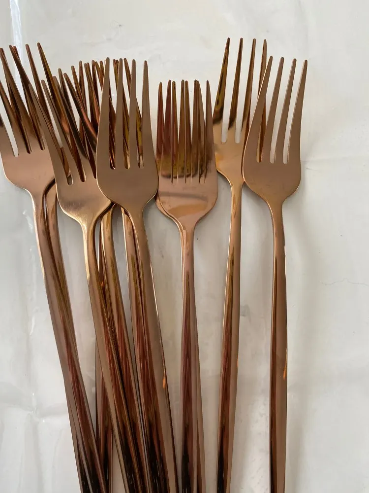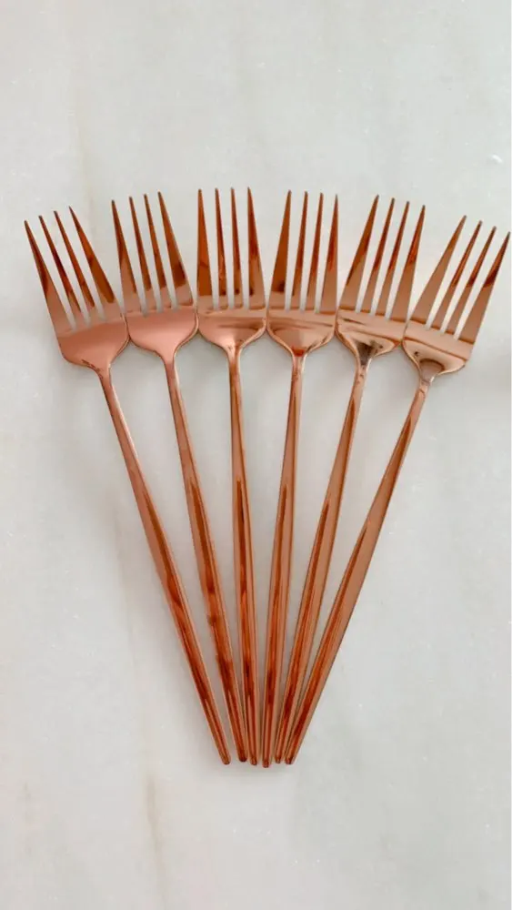 Очень красивые столовые приборы! Достаточно тяжеленькие. Ручка немного длиннее обычной, нож с небольшой режущей поверхностью, но справляется отлично! Цвет просто супер, такой благородный) Доставка быстрая, если учесть, что заказ был сделан 11.11. Было небольшое но, несколько приборов оказались поцарапанными, возможно при транспортировке. Продавец просто умничка, мы пообщались и решили этот вопрос. Заказом более чем довольна и вам рекомендую!