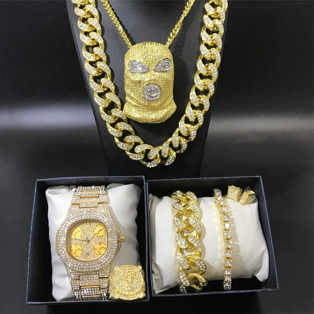 Роскошные мужские золотистые часы, браслеты, кольца и серьги, комплект с кубинским кристаллом Майами, цепочка на шею в стиле хип-хоп для мужчин