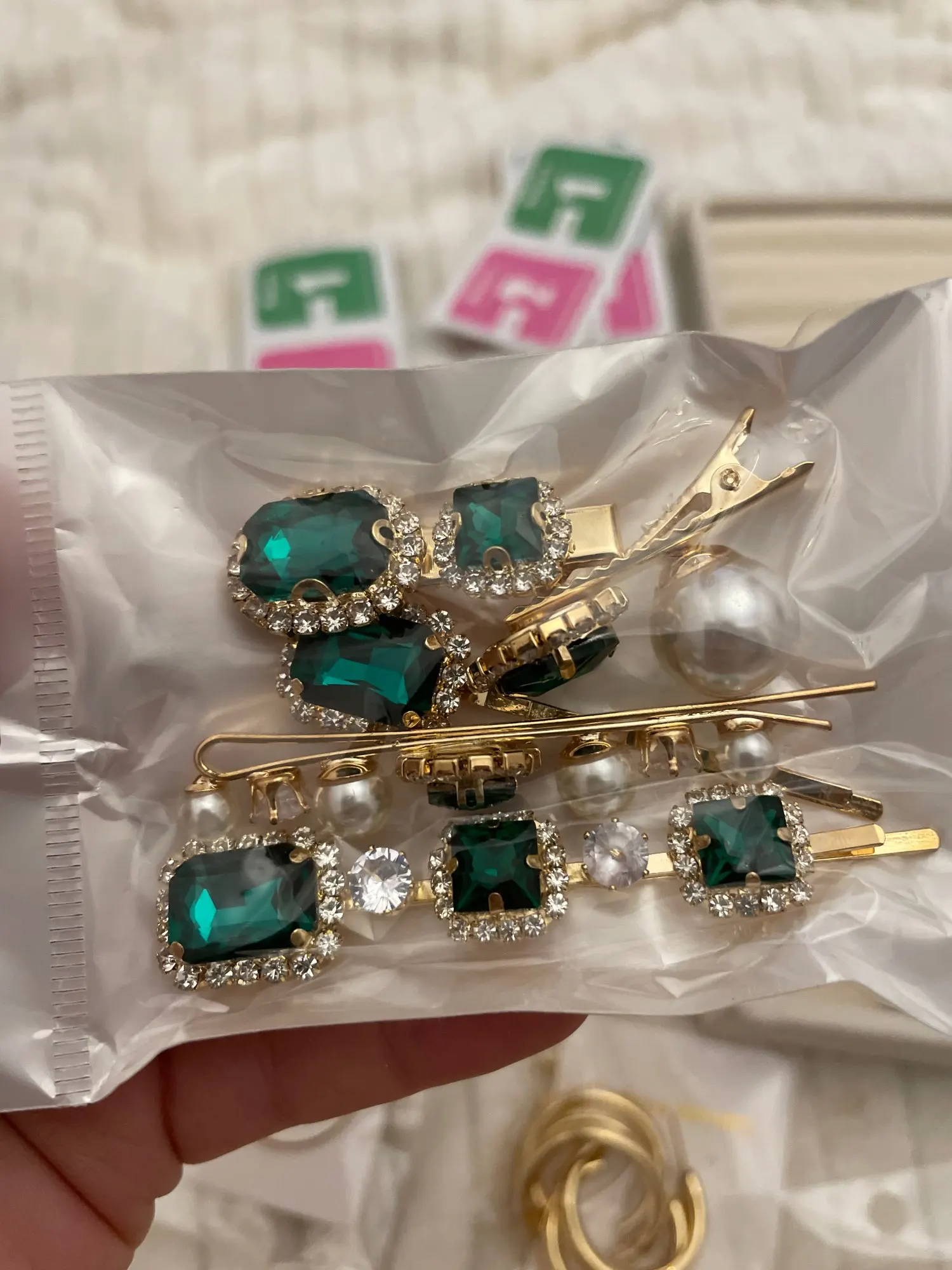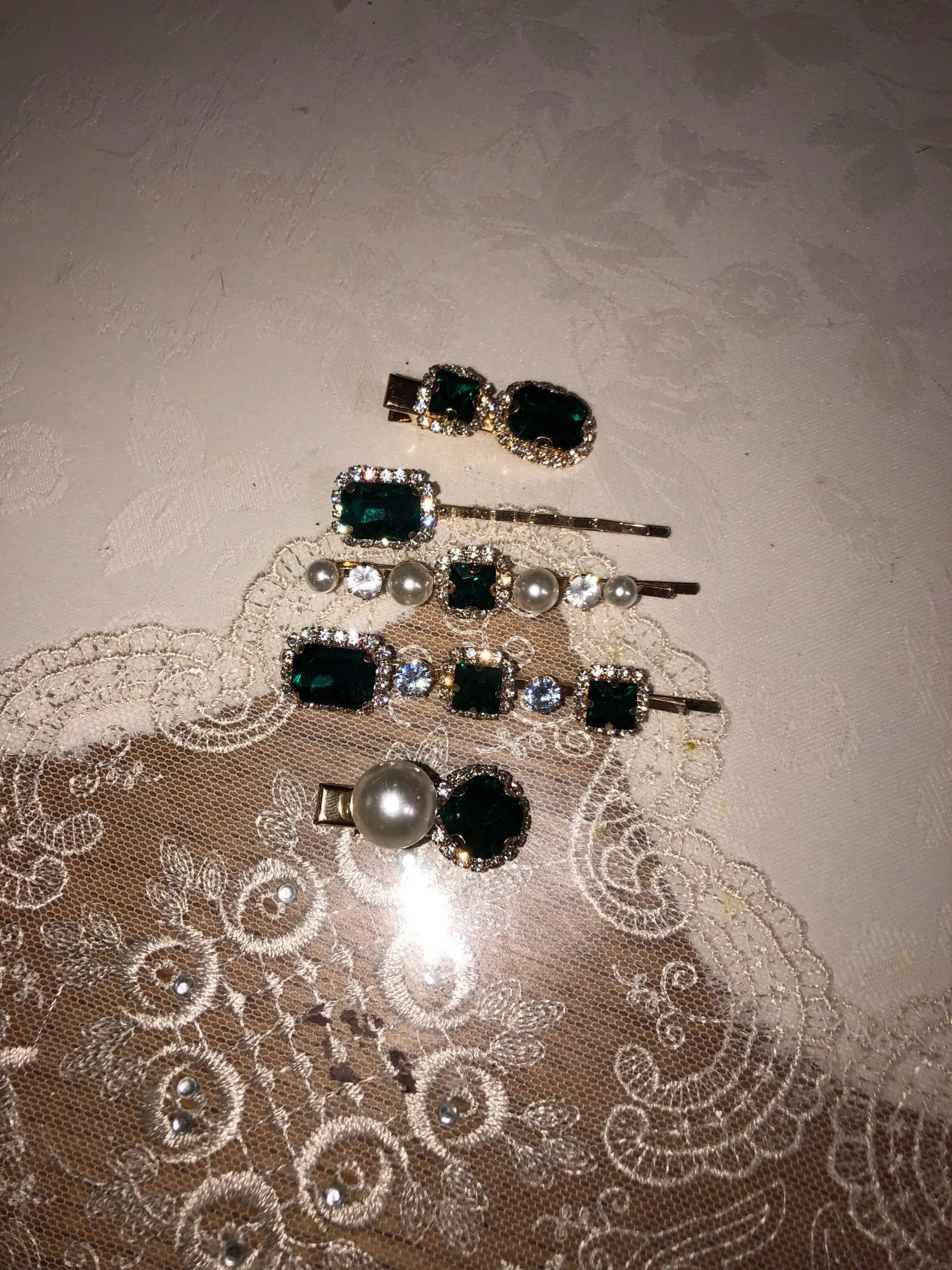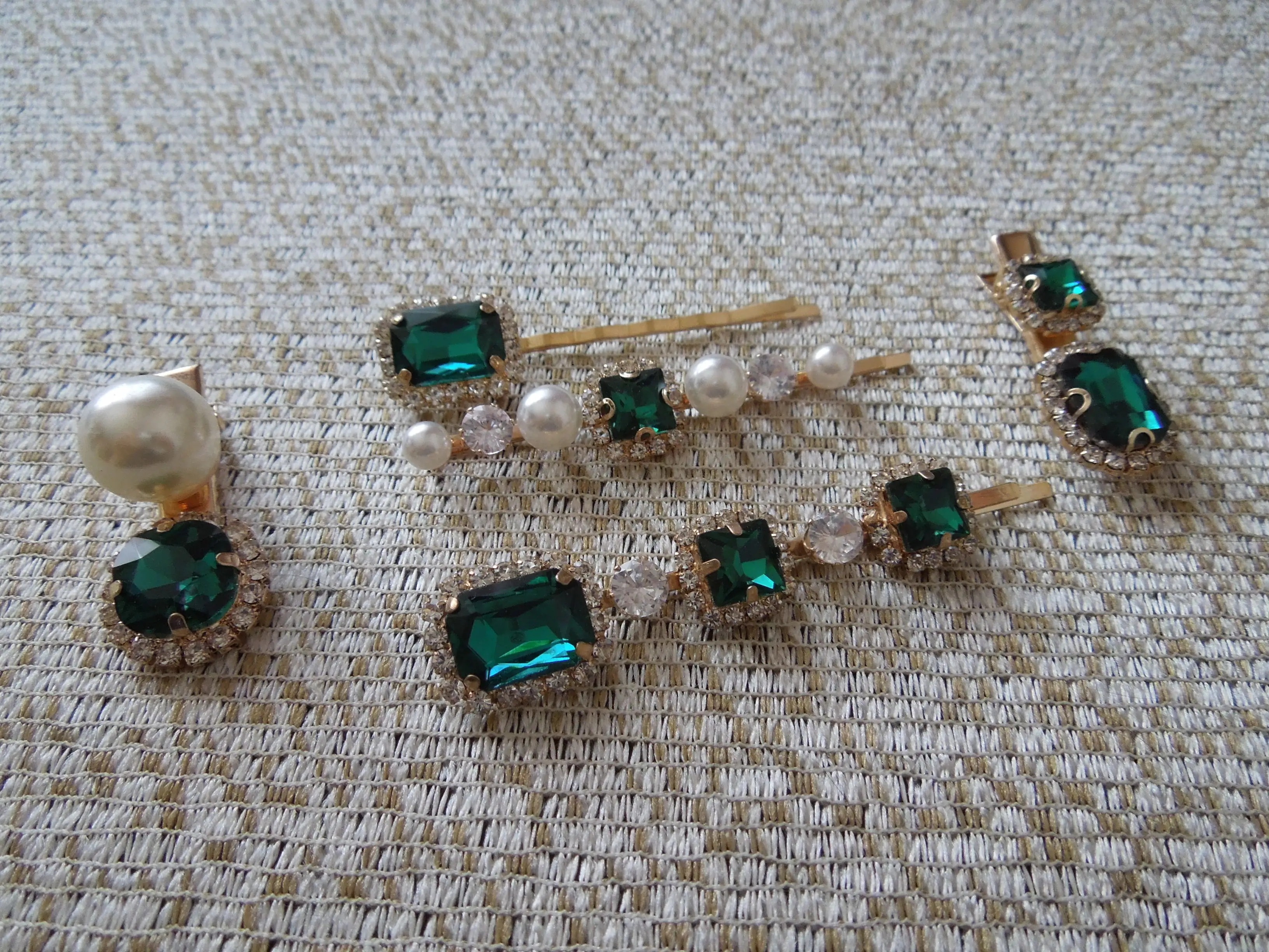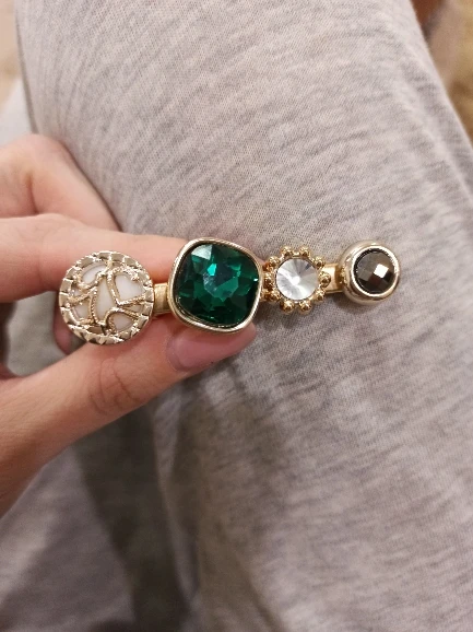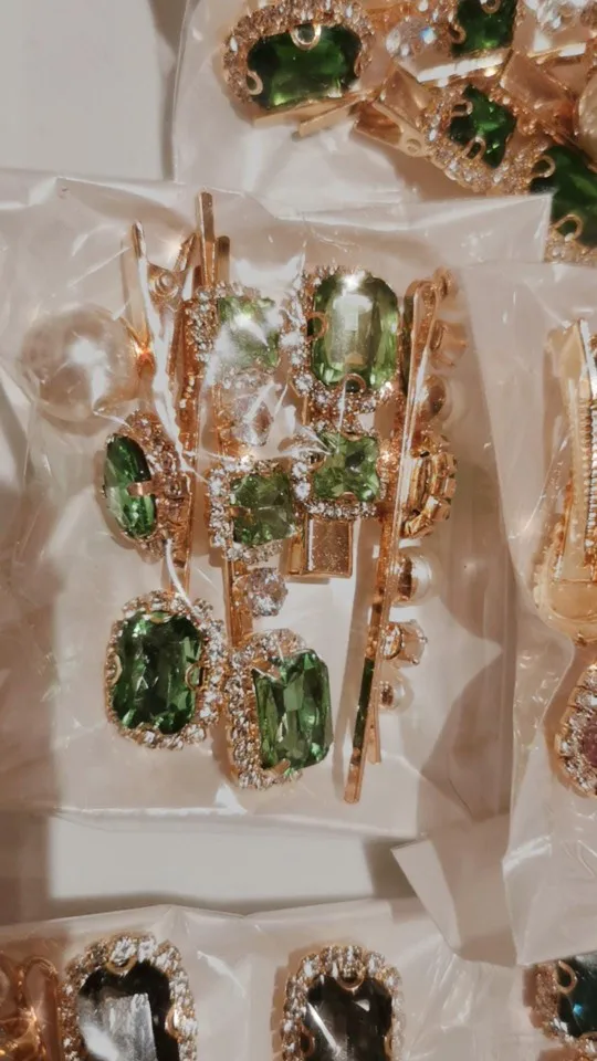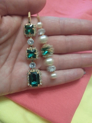 they are really pretty and they match the pictures exactly. the emerald green is on point. the little ones are clips rather than pins which it makes it easier to wear. they feel and look good quality. the stones are welded into the metal so it is sturdy. was shipped within given time.
