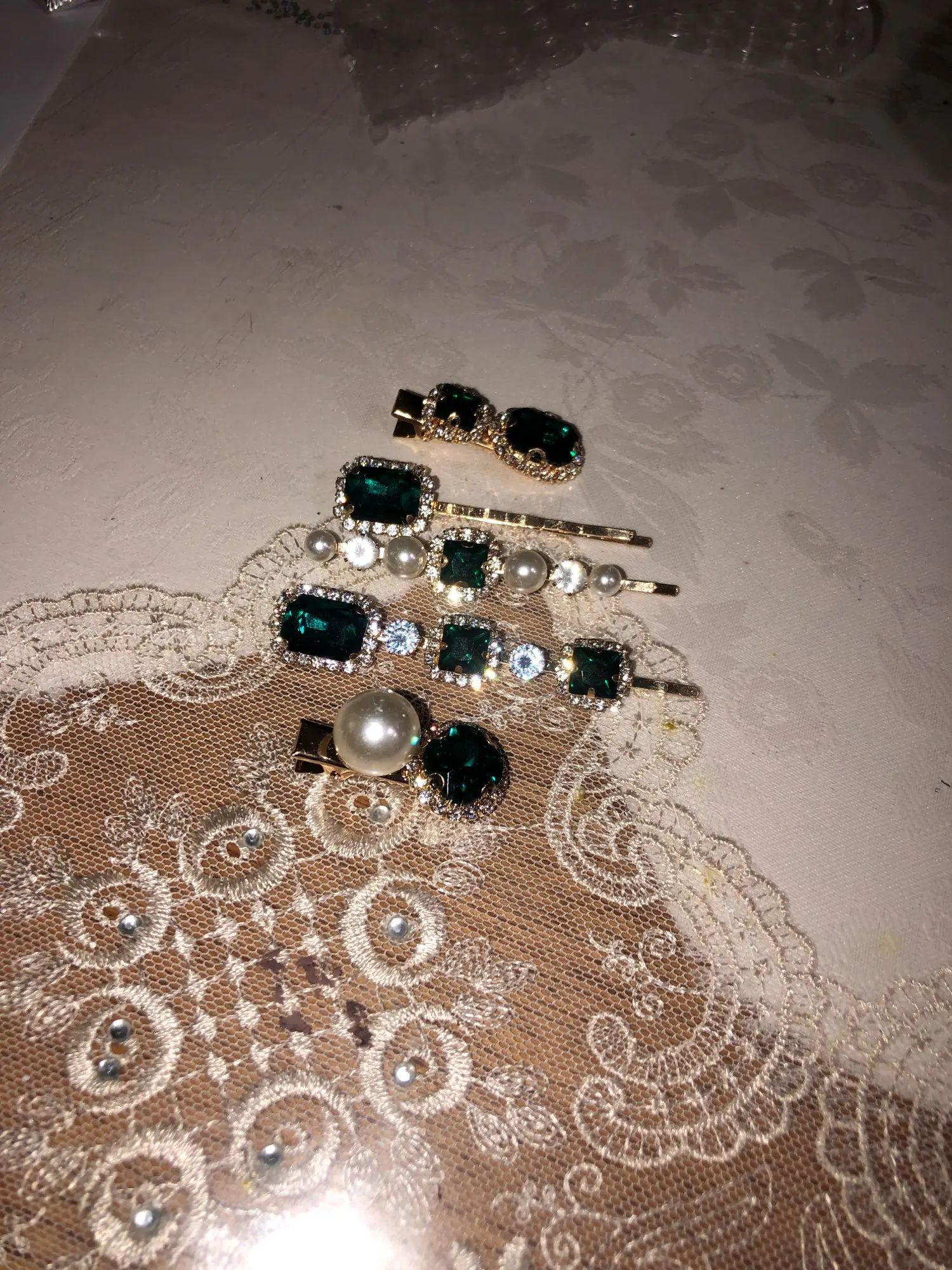 красиво переливается при искусственном освещении, спокойно выглядят при естественном освещении в пасмурную погоду. жемчужинки на заколках поцарапаны, но это не бросается в глаза. возможно поцарапалась при транспортировке, так как были просто сложены в пакете, а не закреплены на картоне. сам пакет был хорошо упакован, в том числе в пупырчатой пленку.