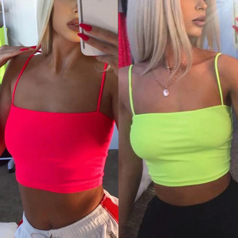 Кроп-топ женский неоново-зеленый, пикантная уличная одежда, облегающий Модный укороченный топ на бретелях, на лето