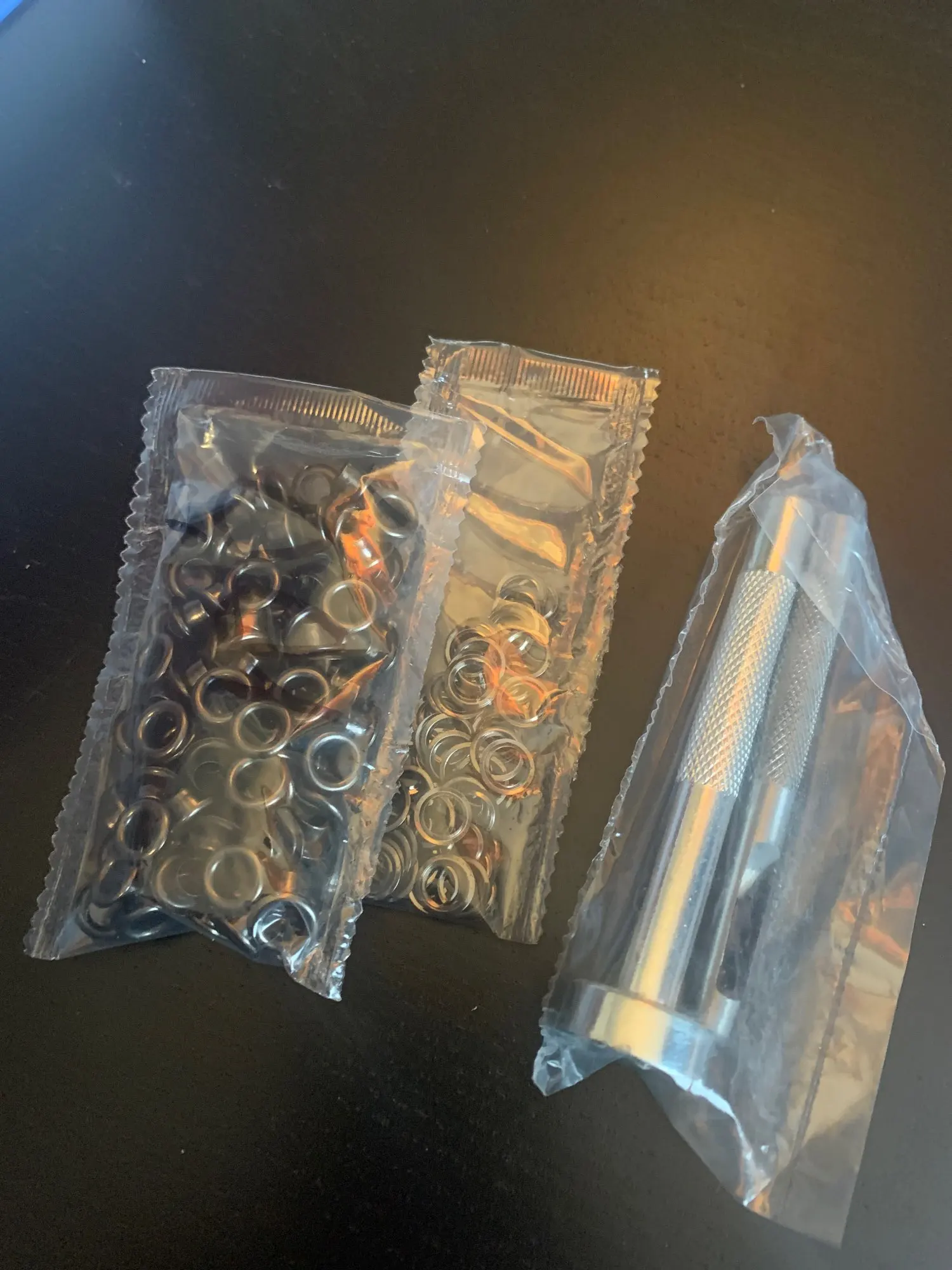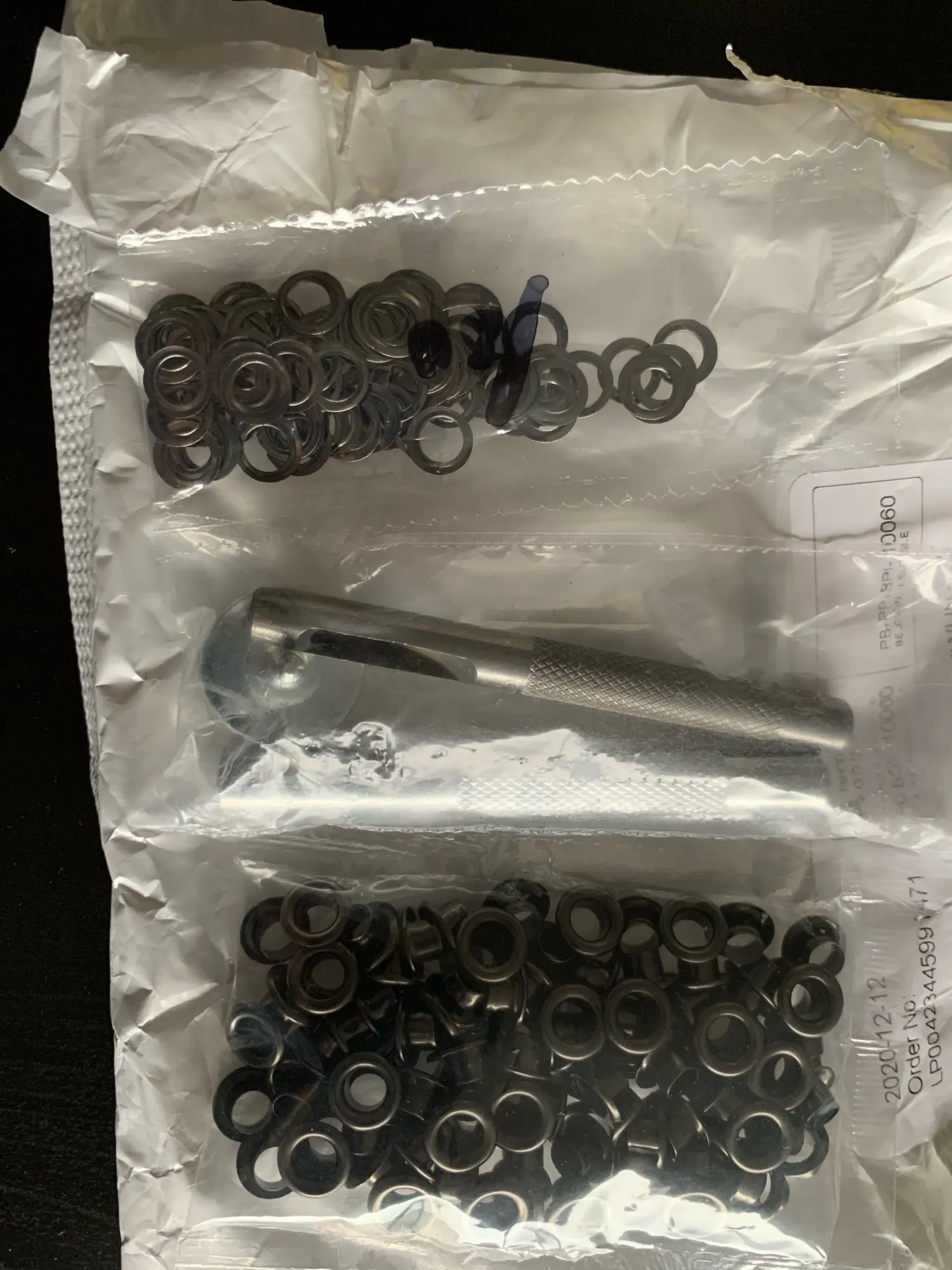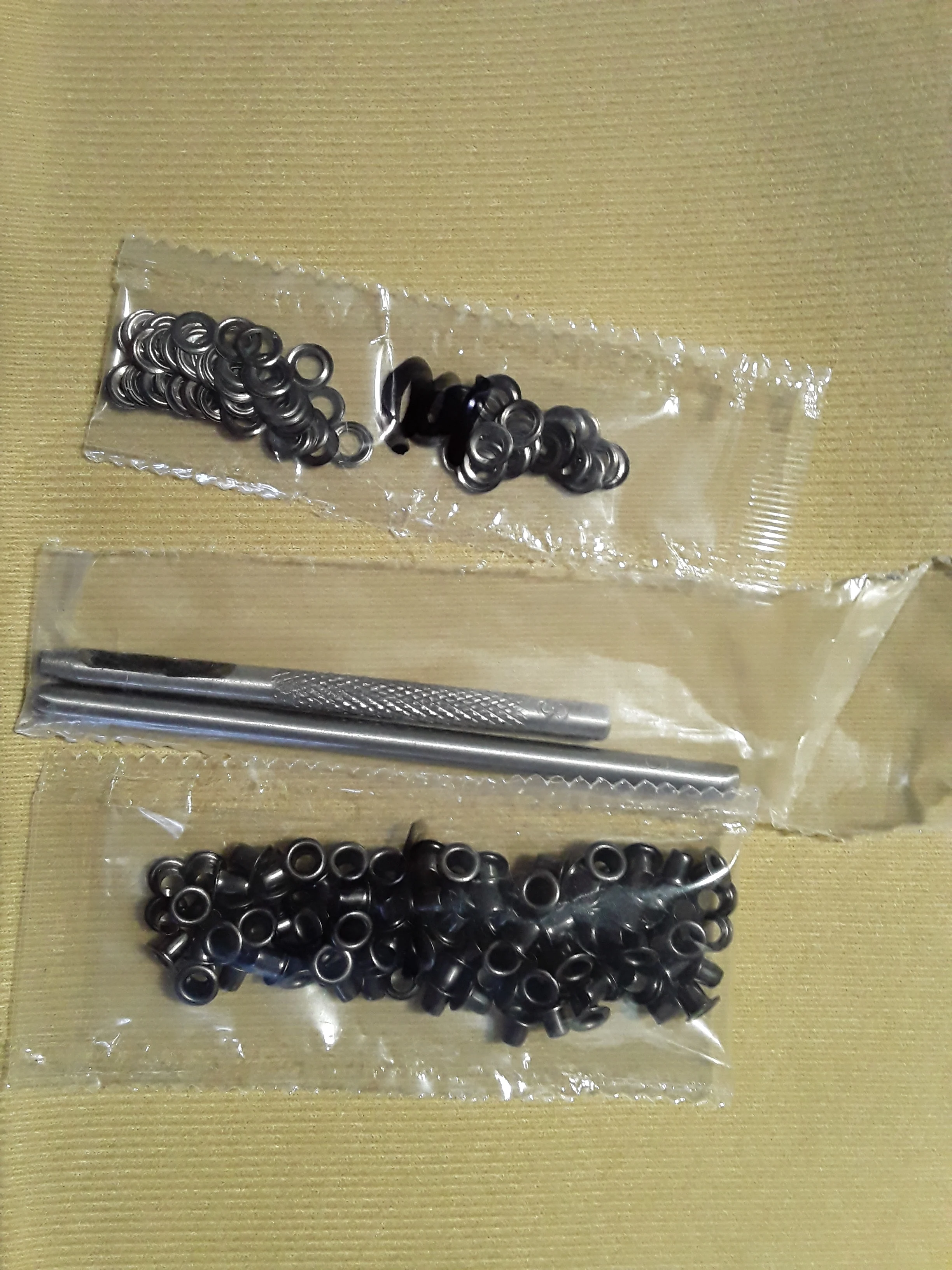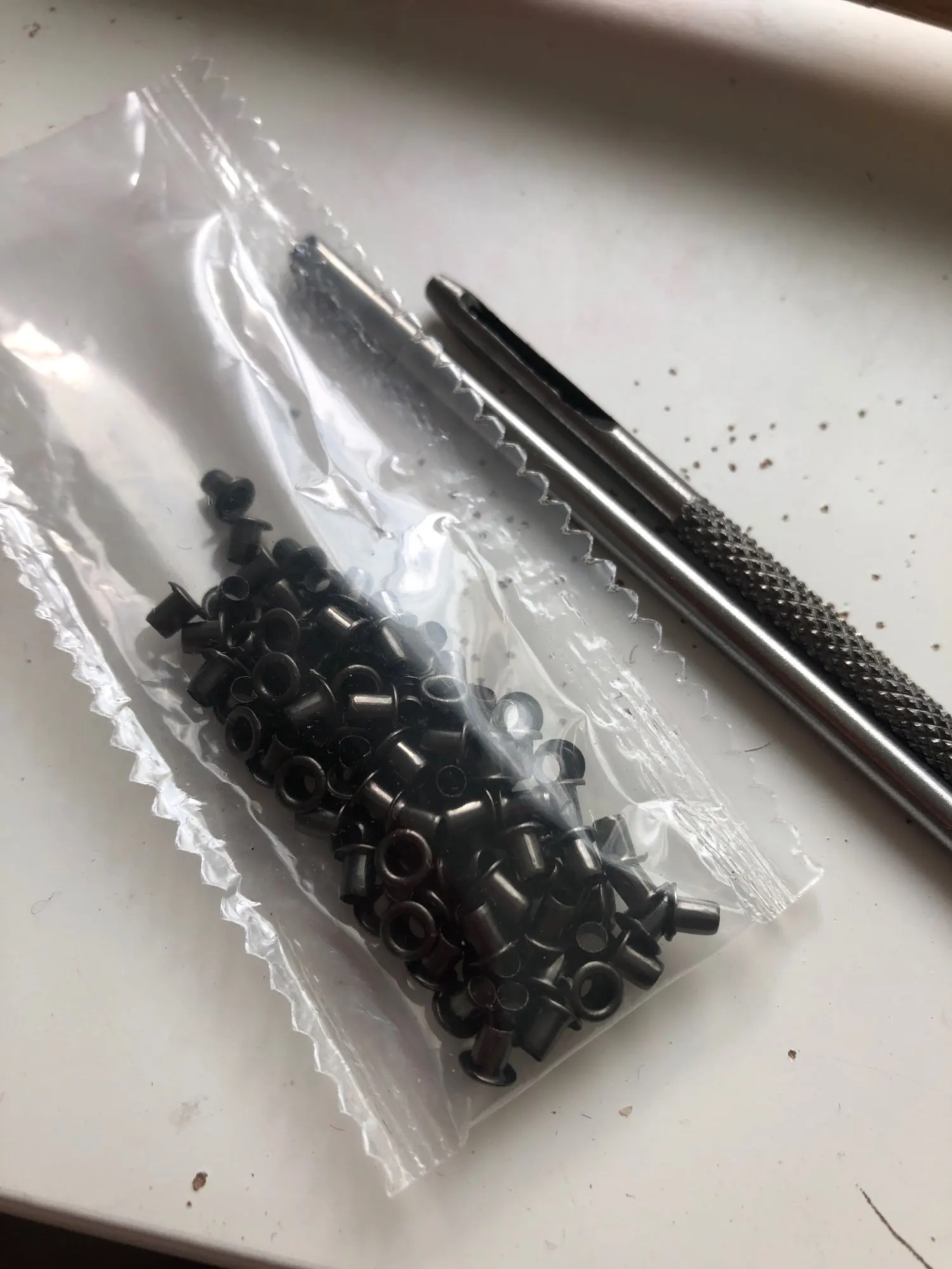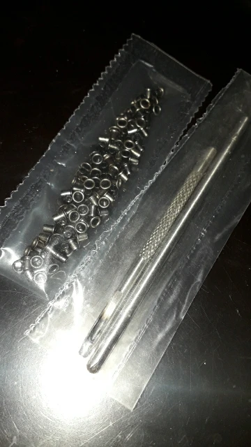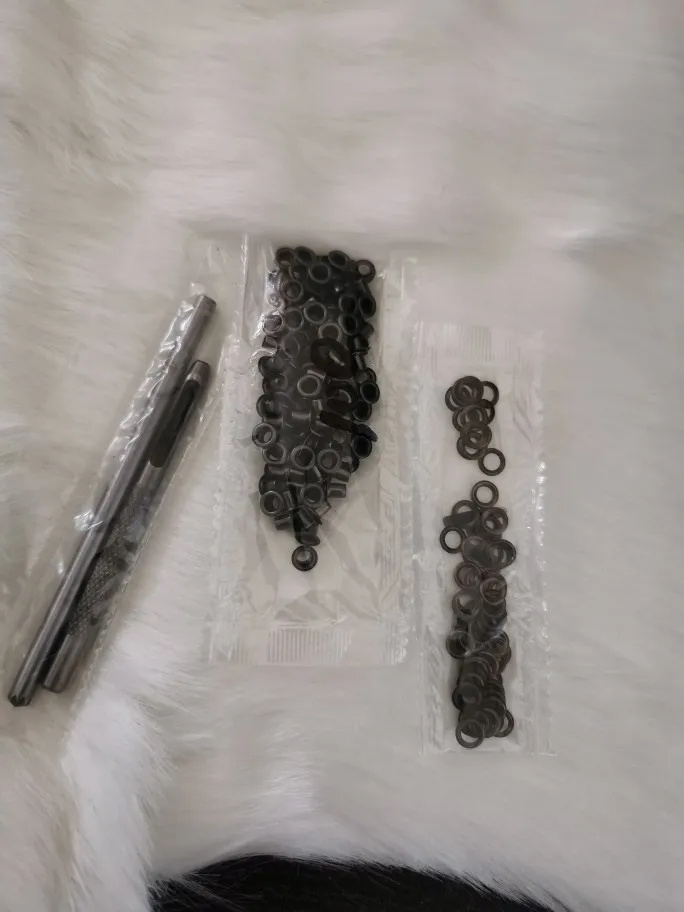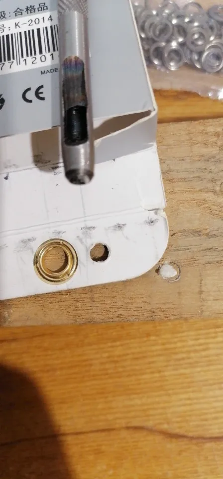 Товар хорош. Количество соответствует. Заказ пришёл в сборной посылке за три недели до Саратова. Пробойник тупой. Проблема быстро решилась наждаком. Установка непростая, но можно сделать. Установка производилась на деревянной поверхности. На фото установка на тонкой замше.