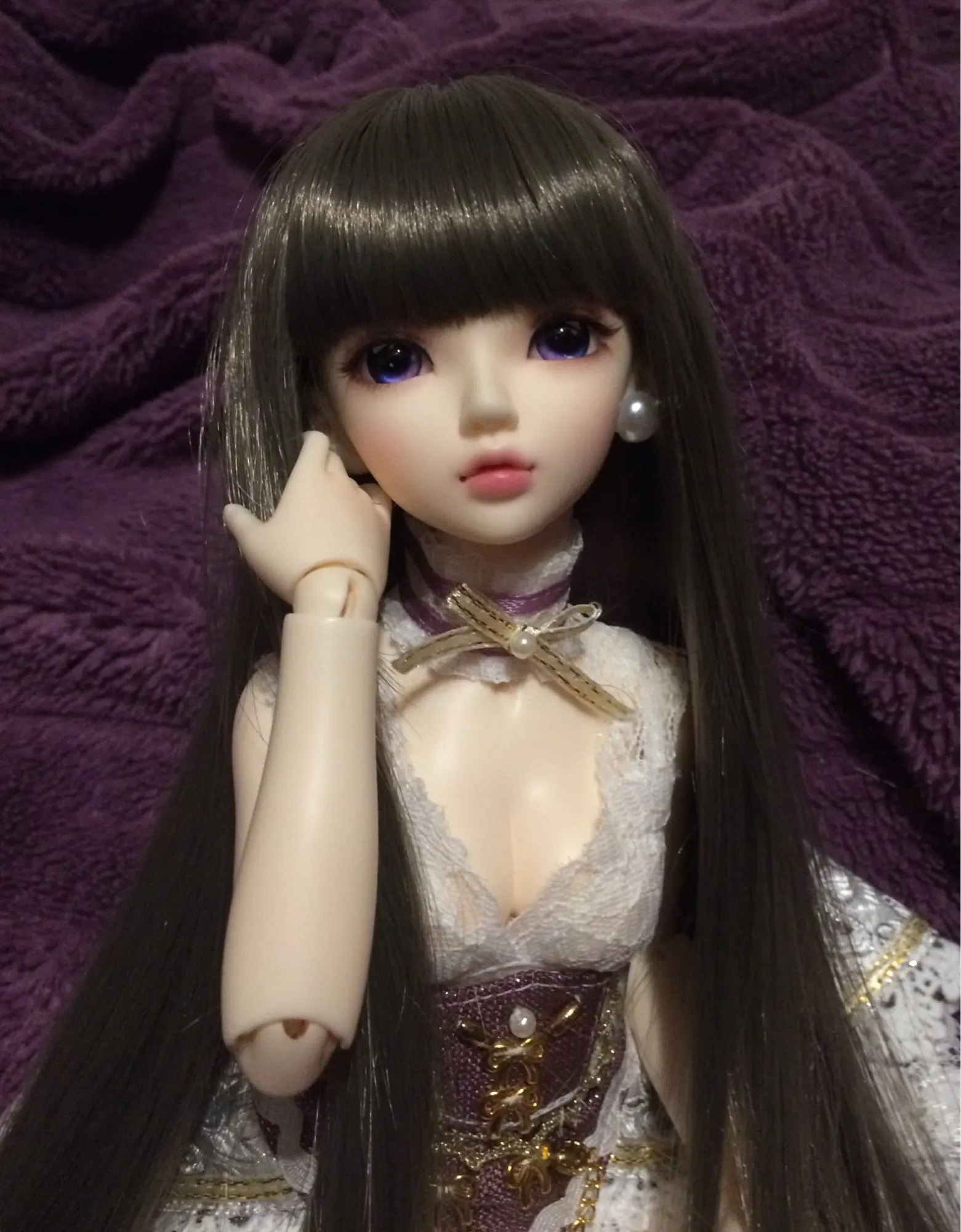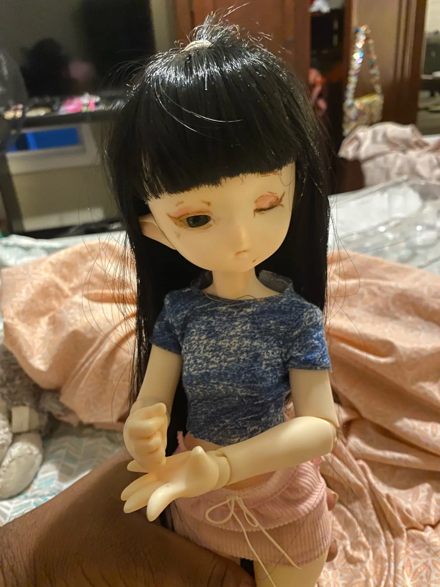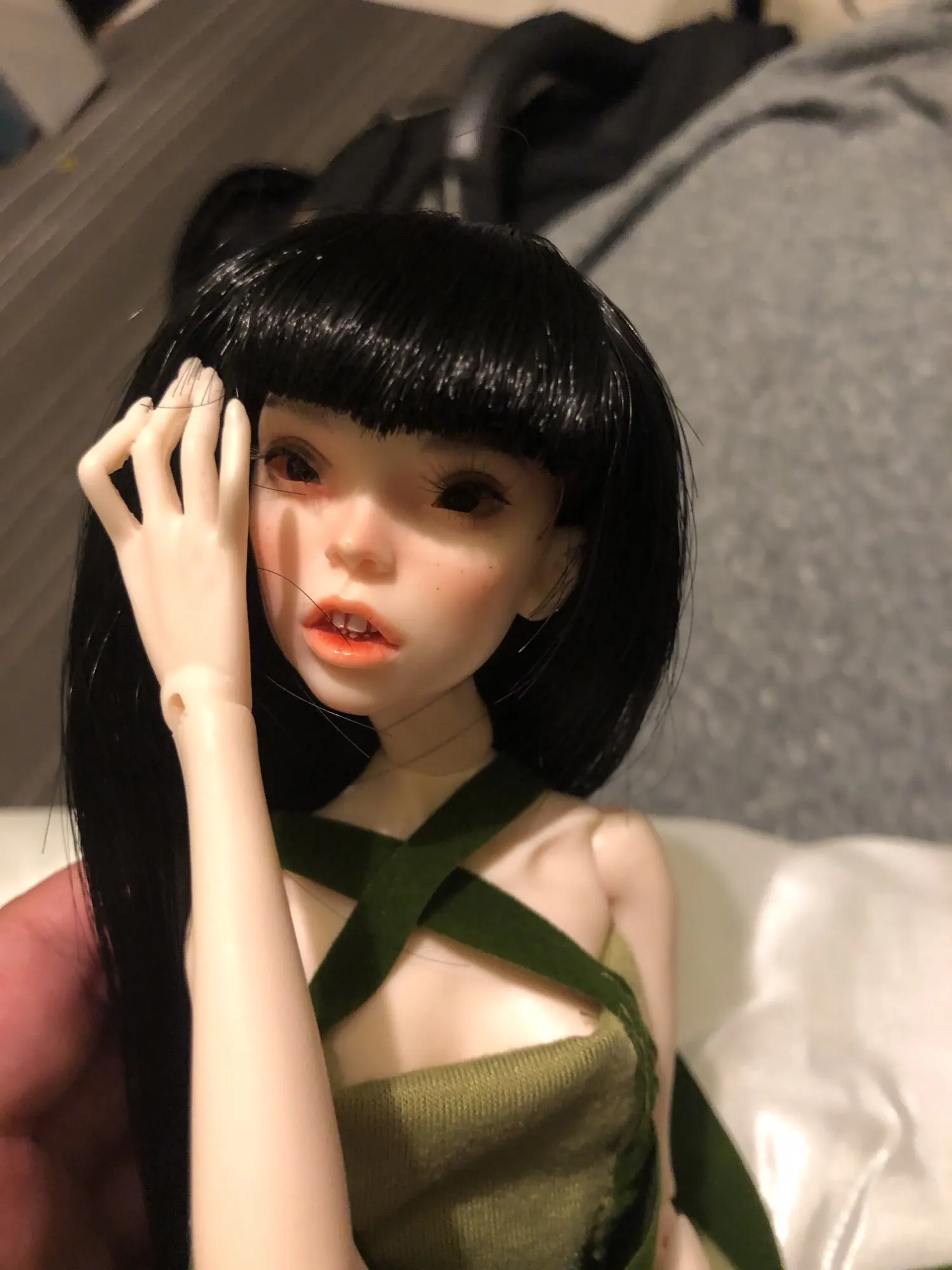 Челка не очень хорошо обрезана, но, как вы видите на фотографиях, она очень длинная. Это suze 1:6, но он маленький для моего Leeke yosd и моего Voljs yosd. Он также не подходит для всех мини-сборов, только те с маленькими головками, такими как Sircca (на моих фотографиях)