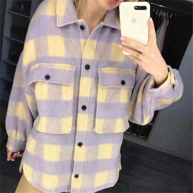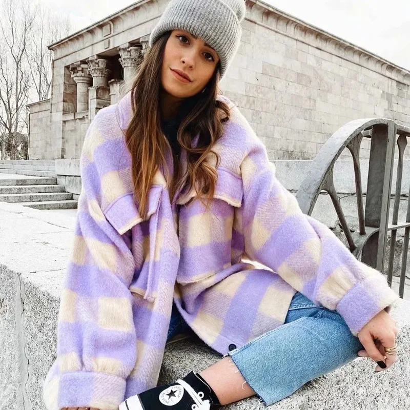 Женская клетчатая куртка на пуговицах, фиолетовая безразмерная курт...