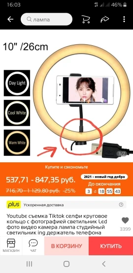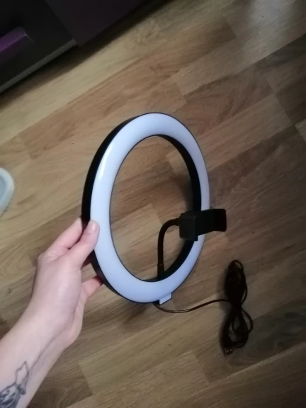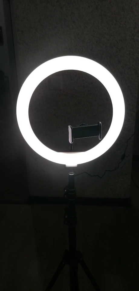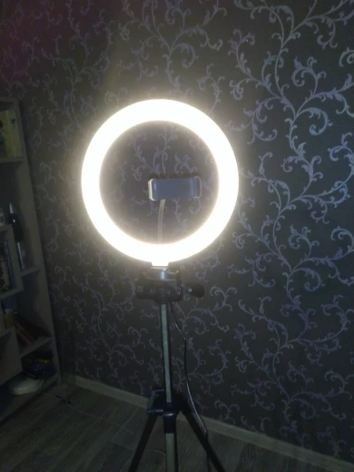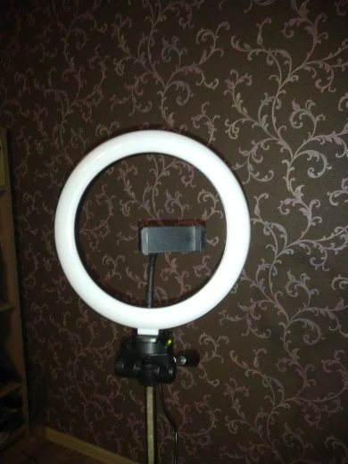 крутая лампа! все четко сделано, пластик крепкий, держатель для телефона оч прочный, за телефон не страшно. есть возможность вкрутить эту лампу на штатив. есть 3 режима света- обычный, холодный и теплый, также регулировка яркости в каждом режиме. на шнуре пульт, шнур с usb, можно запитать от адаптера или через павербанку. жена очень довольна, спасибо! кстате тут за эту цену (за 800р) эта самая большая лампа 26см, так что советую брать тут