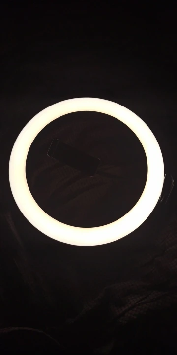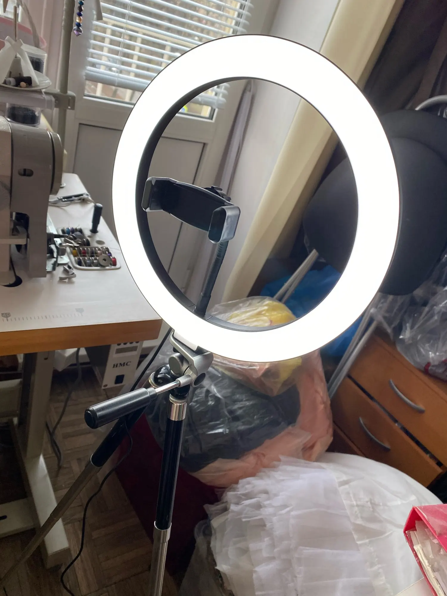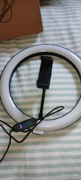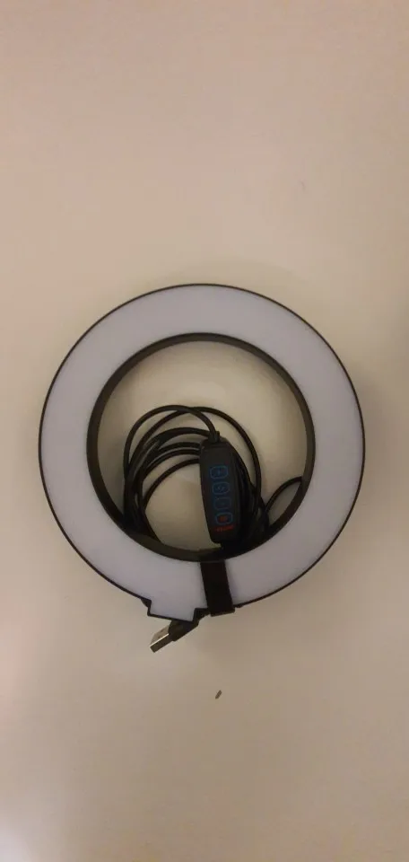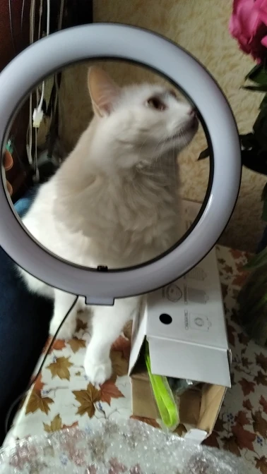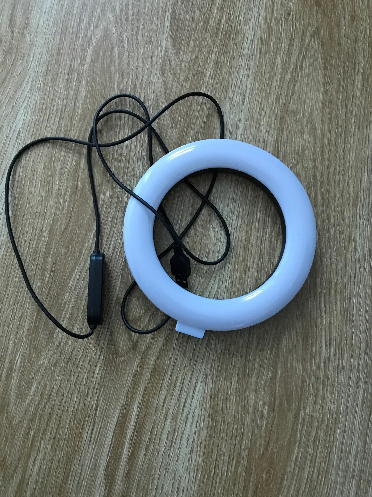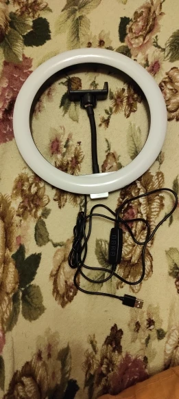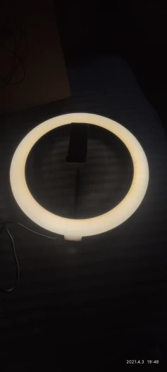 Штука определённо неплохая. Конечно, почта приложила все усилия, чтобы квадратную коробку подогнать к форме лампы - но всё цело и работает. Пластик кажется хлипким, но вроде бы держится всё нормально. Дурацкий гибкий шарнир для держателя телефона: его достаточно сложно изогнуть так, чтобы он расположился по центру и не затенял участки кольца. Впрочем, это мелочи. Надо ещё придумать болтик, чтобы вкручивать в гнездо внутри кольца и крепить видеокамеру. Имеет три цвета - холодный (дневной, порядка 6500К), тёплый (где-то 3000К) и гибридный, плюс десять ступеней яркости. Переключается всё с кнопочного модуля на середине кабеля (типа проходного выключателя). Когда лампа выключена, кнопка ON/OFF подсвечивается синим. Сам кабель длиннющий, около 185 см. Проверял фотоаппаратом - мерцания на слабых режимах вроде бы нет. Поскольку приходится из-за вируса много работать дистанционно - вещь очень нужная. Пять баллов. К тому же быстренько (за 20 дней) привезли в постамат.