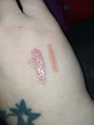 помада хорошая по текстуре по цвету такой светло-коричневый консервативной тонн но блеском пользоваться не стала попадает на зубы и и на зубах как будто стеклдовата хрустит