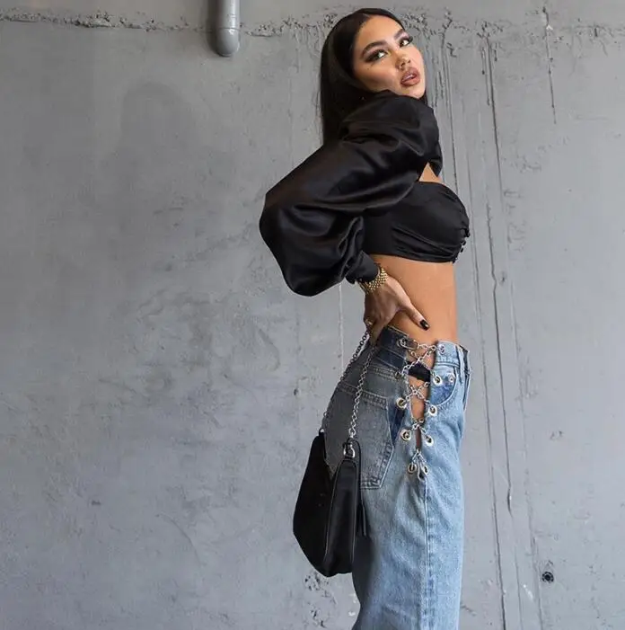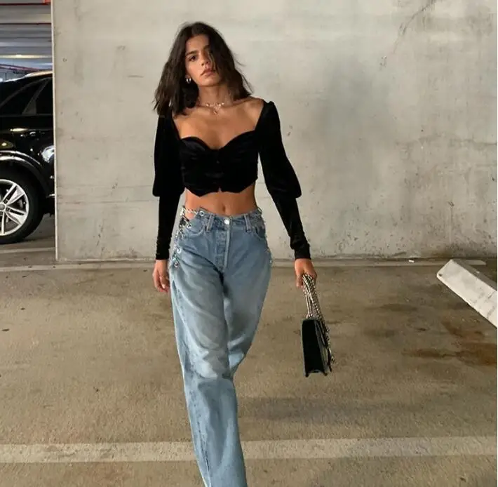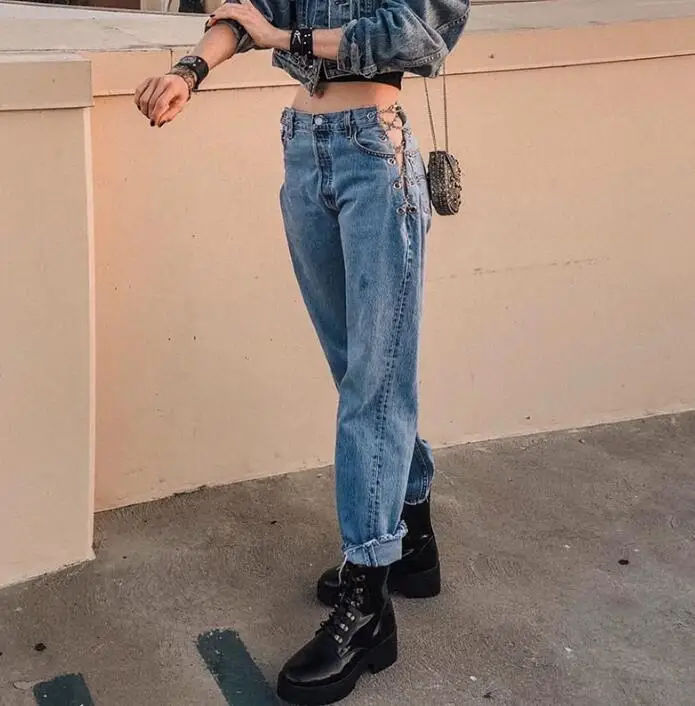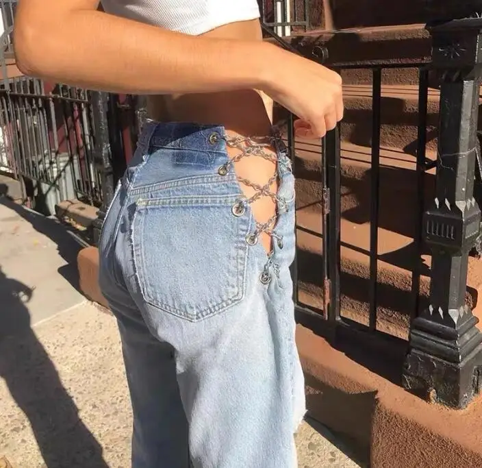 Летние джинсы, соблазнительные прямые брюки с разрезом и асимметричной цепочкой