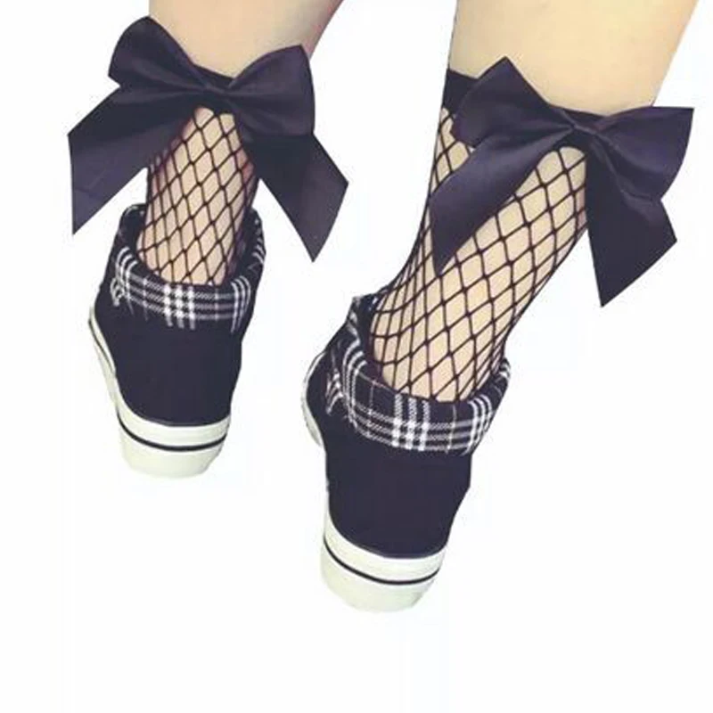 Женские винтажные ажурные короткие носочки по щиколотку, кружевные носки в сеточку с рыбками и бантом, женские носки в сеточку