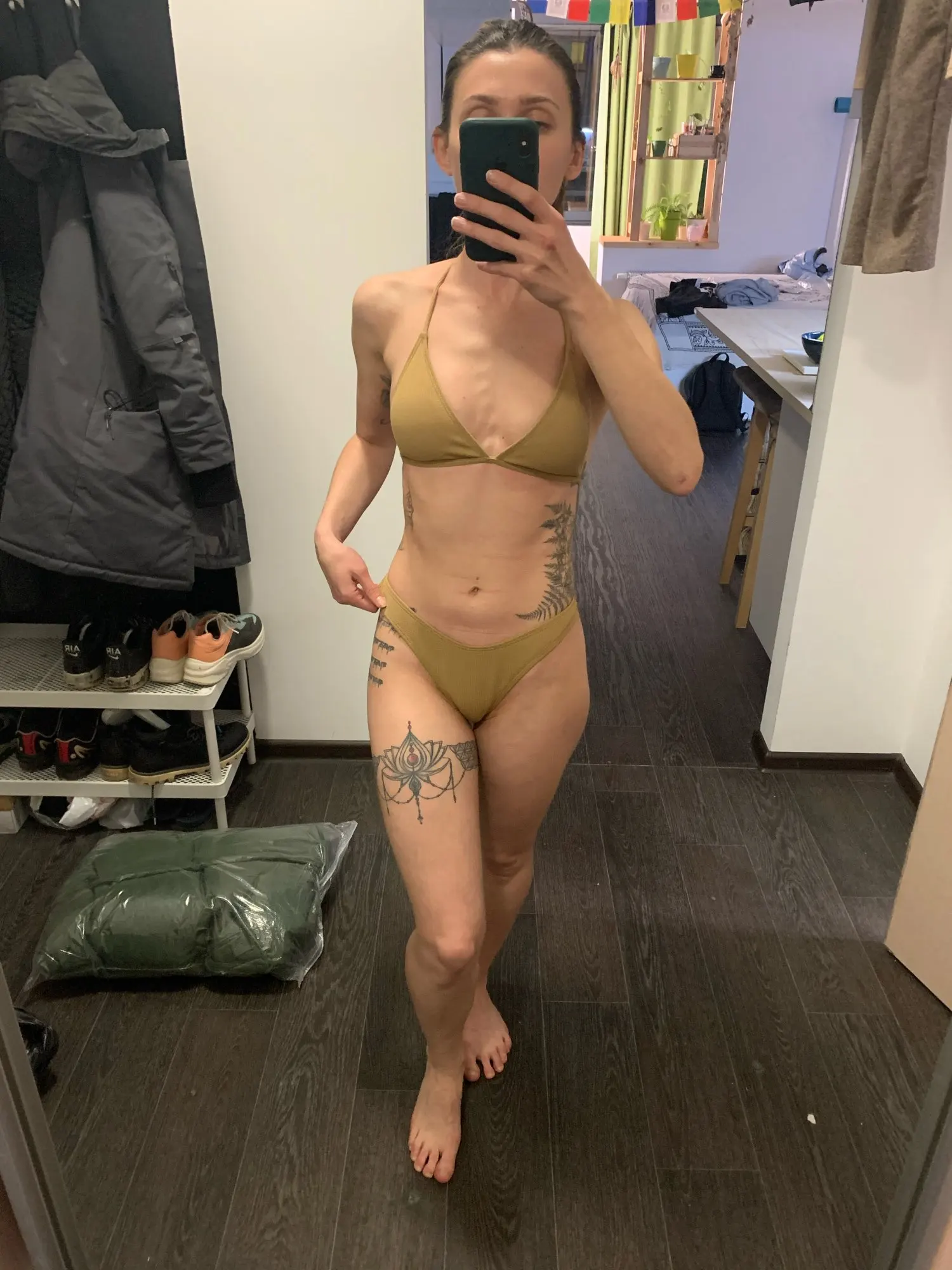 Получил размер, чтобы быть уверенным, топ идеально сидит, но нижняя часть немного маленькая, но ничего, что не может быть решено небольшой потерей веса (что я в любом случае хочу сделать)
