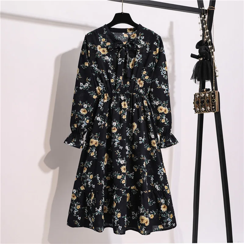 Шифоновое Платье-миди вечерние длинным рукавом, цветочным принтом и оборками