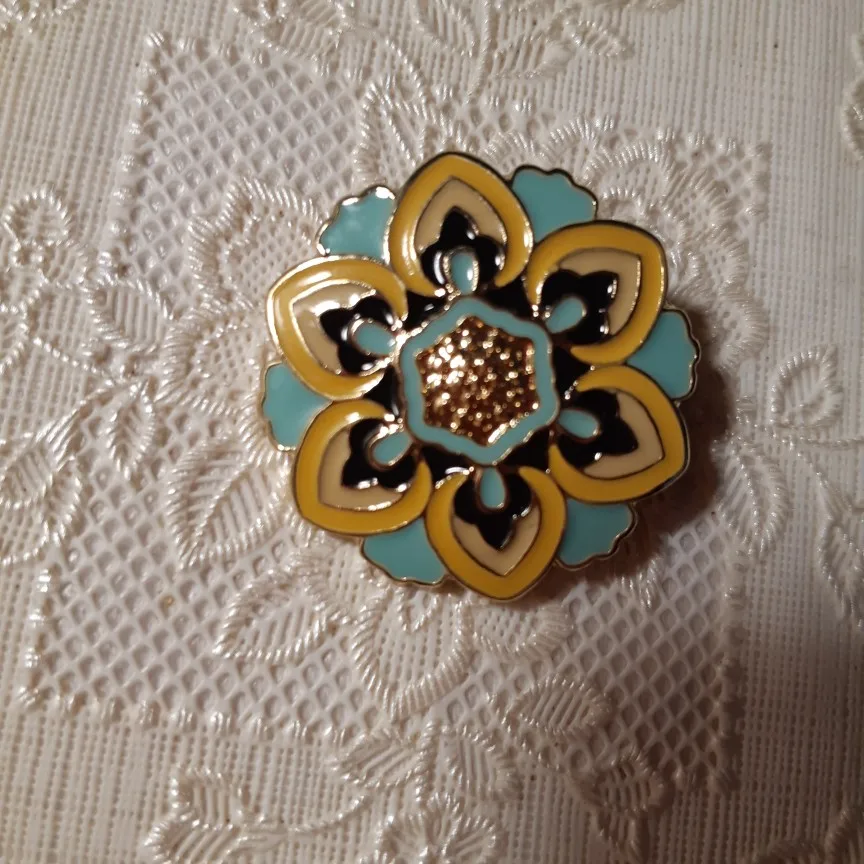 Брошь выглядит как на фото продавца. Очень аккуратно выполнена заливка эмали. Диаметр по выступающим частям 3 см. Хорошая застежка.