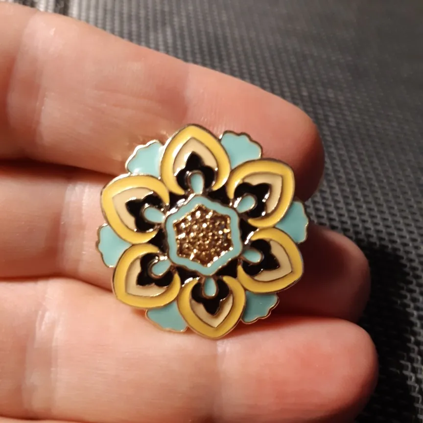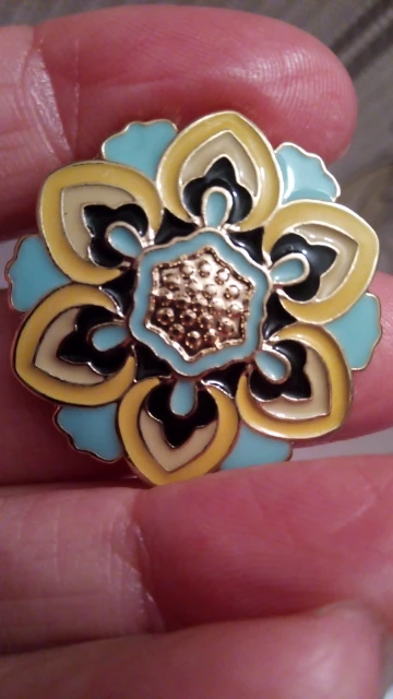 Брошечка маленькая, но очень красивая, напоминает что-то типа восточного орнамента. Сделана аккуратно, сверху покрытие- эмаль, нигде ничего не растеклось, придраться не к чему. Единственный минус, это булавка, вся хлябает в разные стороны, плохо сделана в месте ее основания, ну ладно, посмотрю насколько её хватит. Барашек, который закрывает иглу, надёжный, держит хорошо. Брошь мне очень понравилась, спасибо!