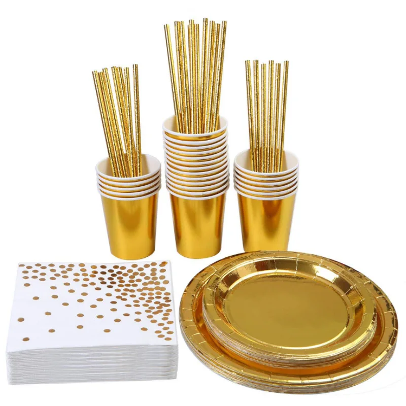 8 шт. в комплекте: 10 шт.X9 дюймовые пластины, 10 шт.X7 дюймовые пластины, 10 шт.X9oz бумажные стаканчики,10 штX6.5 ”бумажные салфетки,10 штСолома,10 штЗолотые пластиковые вилки,10 штНожи и10 штЛожки(Всего: 80 шт.)