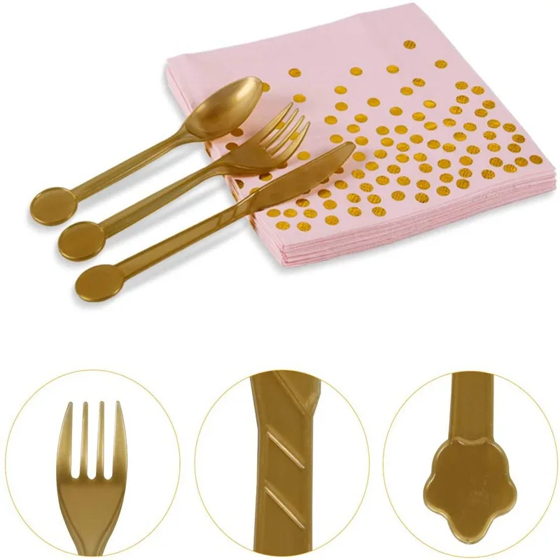 Белые и золотые вечерние принадлежности: Эти привлекательные золотые тарелки в горошек из фольги на белой бумаге, десертные тарелки, чашки, салфетки обязательно понравятся всем. Золотые пластиковые вилки, ножи, ложки, добавляют элегантности и современности в любые вечерние. Идеальный выбор для розового и золотистого сладкий с днем рождения Тематические вечерние.
