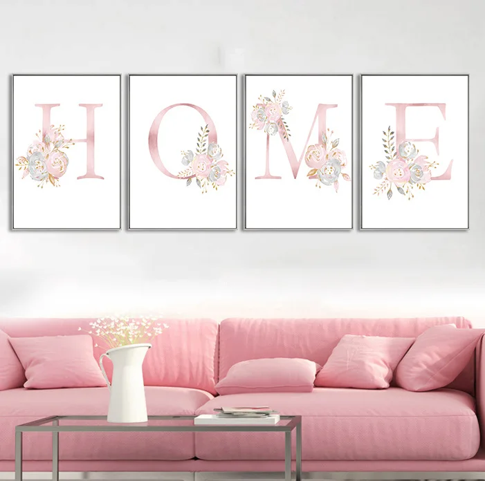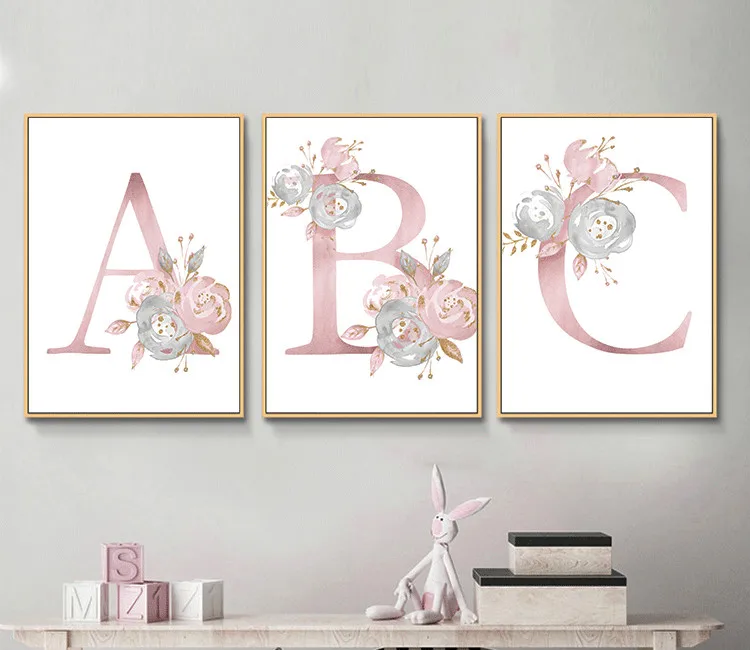 Картина на холсте для детской комнаты, 26 английских букв, розовые цветы, Картина на холсте для спальни