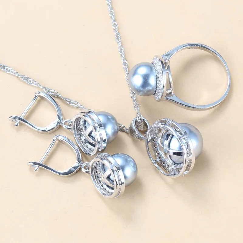 Серый натуральный пресноводный жемчуг серебряный цвет Ювелирные наборы для женщин свисающиесерьгиожерелье и кольцо наборы