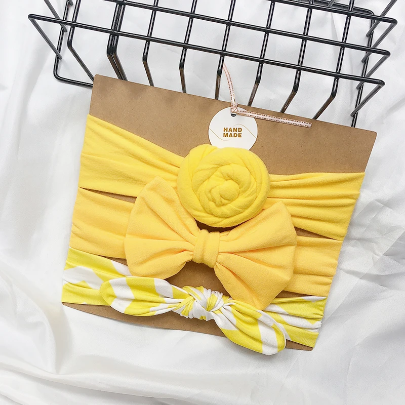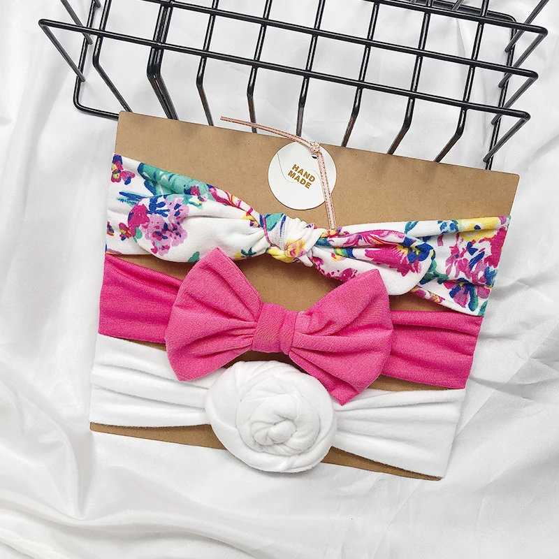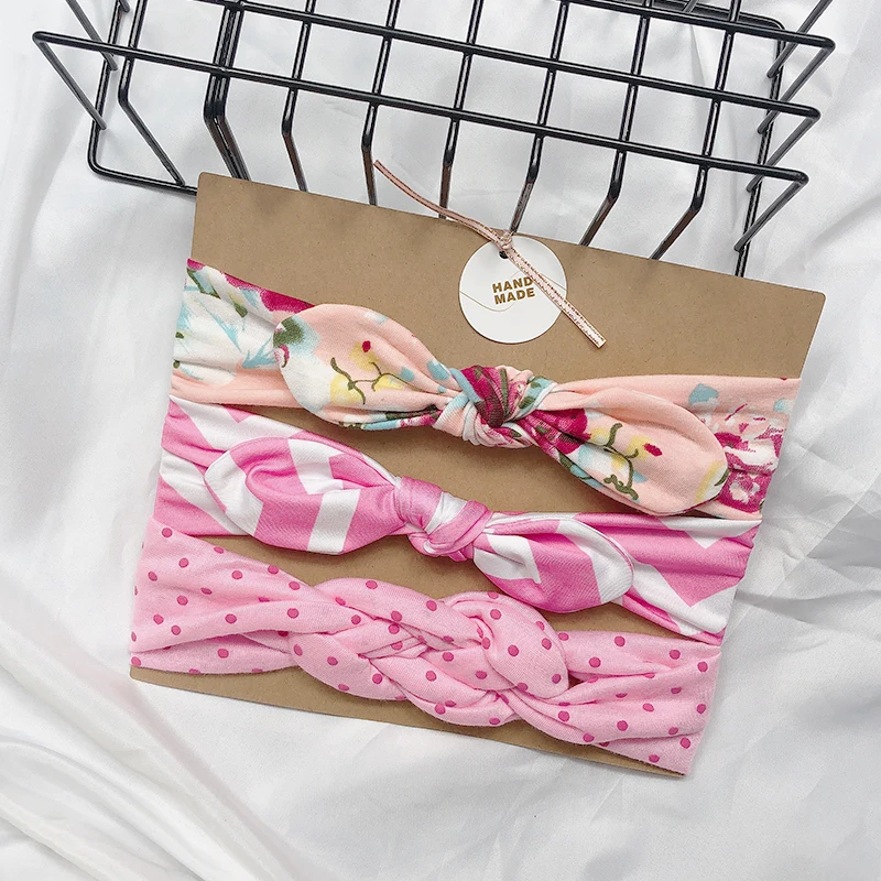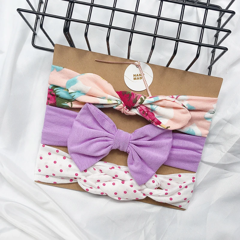 Хлопковая однотонная повязка на голову в горошекполоскус цветочным принтом, 3 шт.лот, эластичные повязки на голову с бантом, тюрбан, Детские аксессуары для волос для девочек Bbay