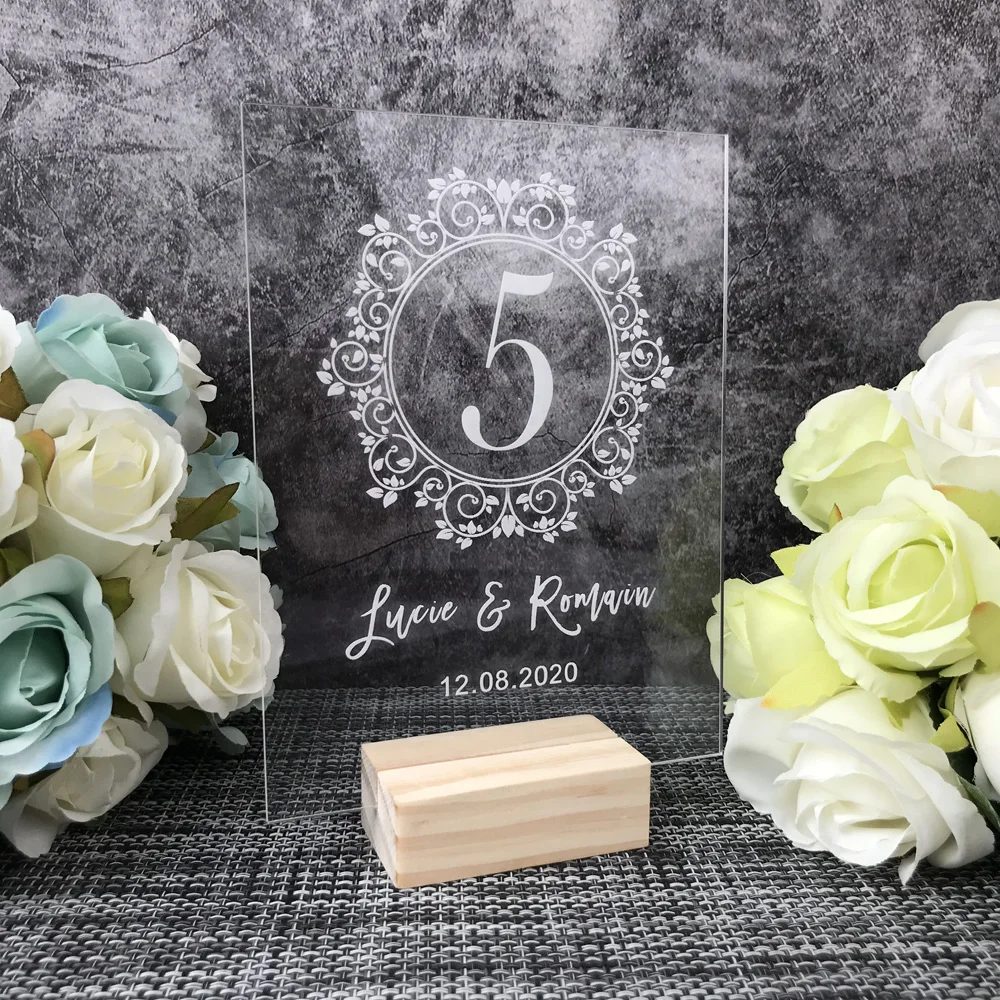 Имя пары на заказ и дату современные номера свадебных столов с подставкой держатели каллиграфия акриловый венок номер стола свадьба