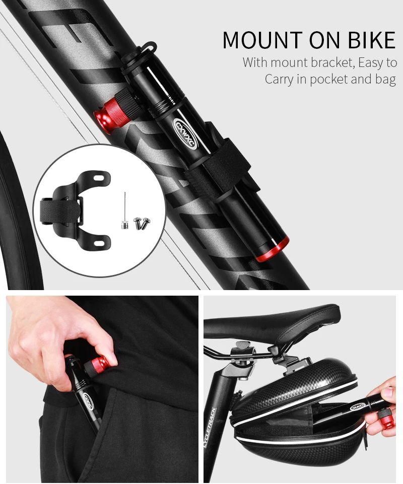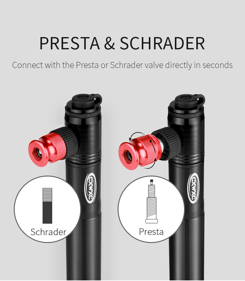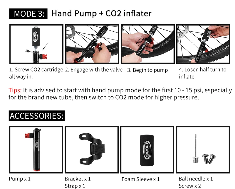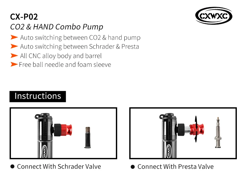 Модель: CX-P02; Макс. Давление: 160 PSI; Материал: алюминиевый сплав; Вес: 97 г (только насос); Цвет: черный, серебристый; Головка: Переходник клапана Schrader & Presta; Аксессуары: насос, кронштейн крепления, шариковая игла, поролоновая втулка, шурупы;