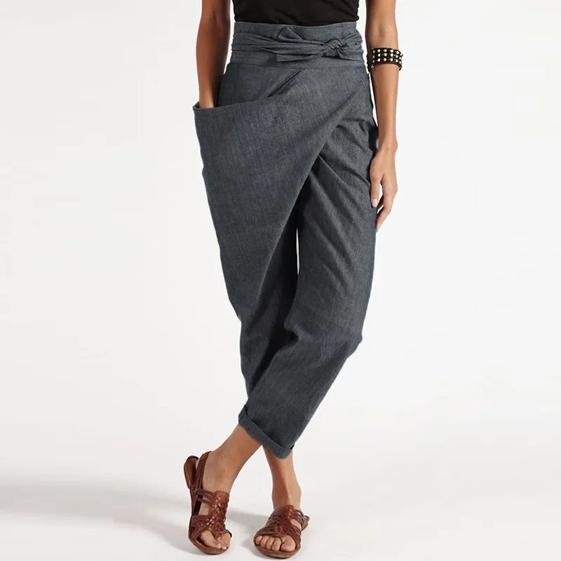 Женские офисные штаны из льна и хлопка, брюки с высокой талией, повседневные Модные свободные серые брюки до щиколотки с поясом, одежда в минималистичном стиле
