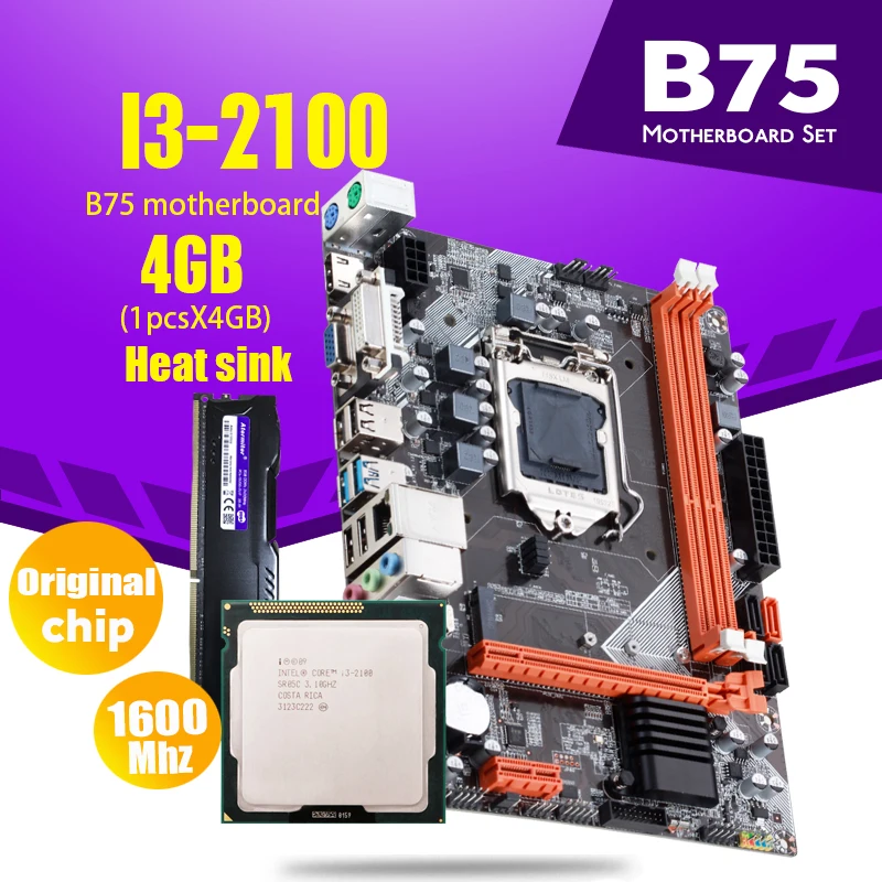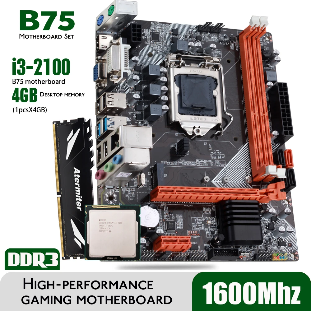 Комплект материнской платы Atermiter B75, с процессором Intel Core I3 2100, 1x4 ГБ = 4 Гб, 1600 МГц, DDR3, с радиатором для настольного ПК, USB3.0, SATA3