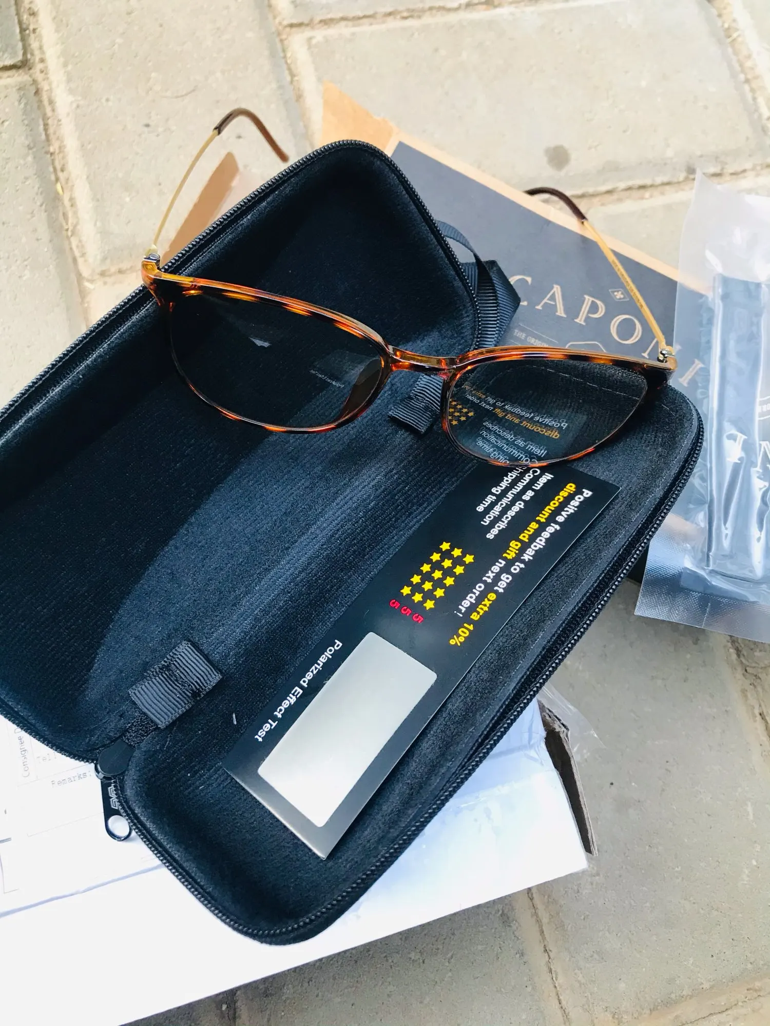Очень, очень тонкая оправа и пластик линзы. Упаковка классная, сами очки выглядят подозрительно хрупко. Поляризационные свойства присутствуют, машину пока в них не водила.