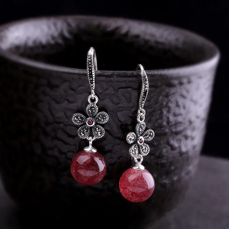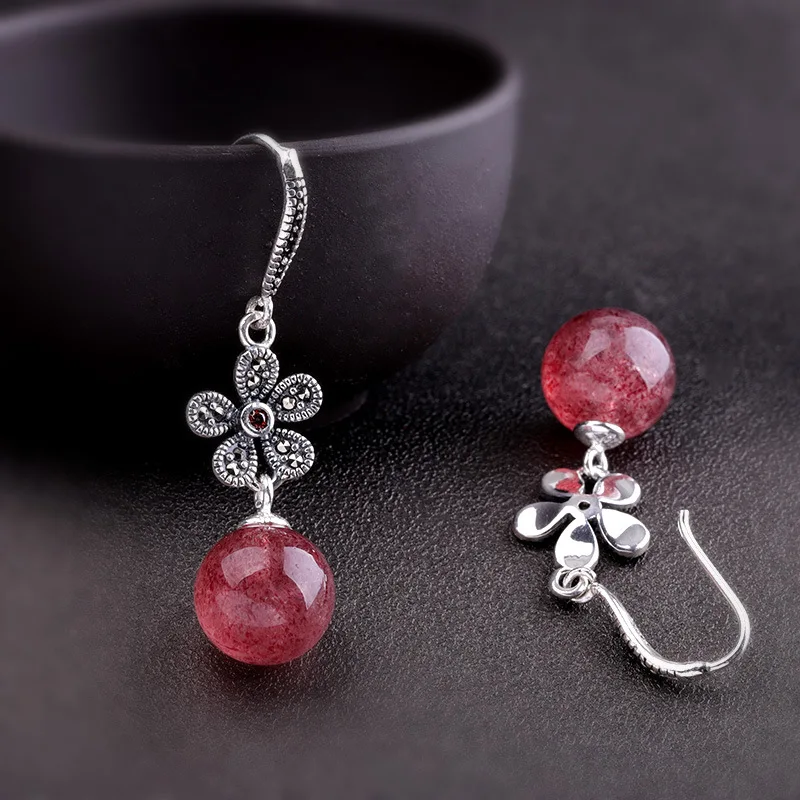 Серьги женские из серебра 925 пробы, с натуральным клубничным кварцем и гранатом