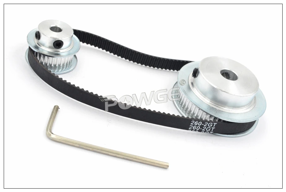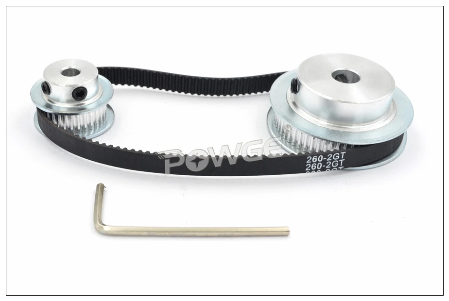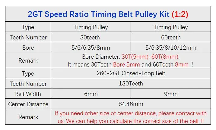 ПСписок упаковок включает в себя как FOllow: 1 шт.X 30 зубьев GT2 Алюминиевый шкив5/6/6.35/8Мм Диаметр отверстия1 шт.X 60 зубьев GT2 Алюминиевый шкив5/6.35/8/10/12Мм Диаметр отверстия4pcsx M4Винты (бесплатно)1 шт. х шестигранный ключ(Бесплатно)1 шт. X 260-2GT резиновый ремень с петлейШирина 6/9 мм