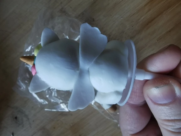 Es igual que en la foto. Tamaño pequeño, pero ideal para decorar tartas infantiles. Ojo, parece figura de azúcar, pero no se come. No vaya a ser que los peques quieran hincar el diente. Se clava como con un palillo.