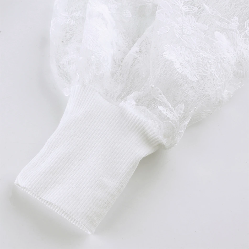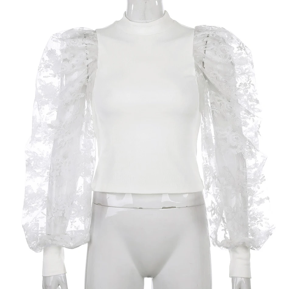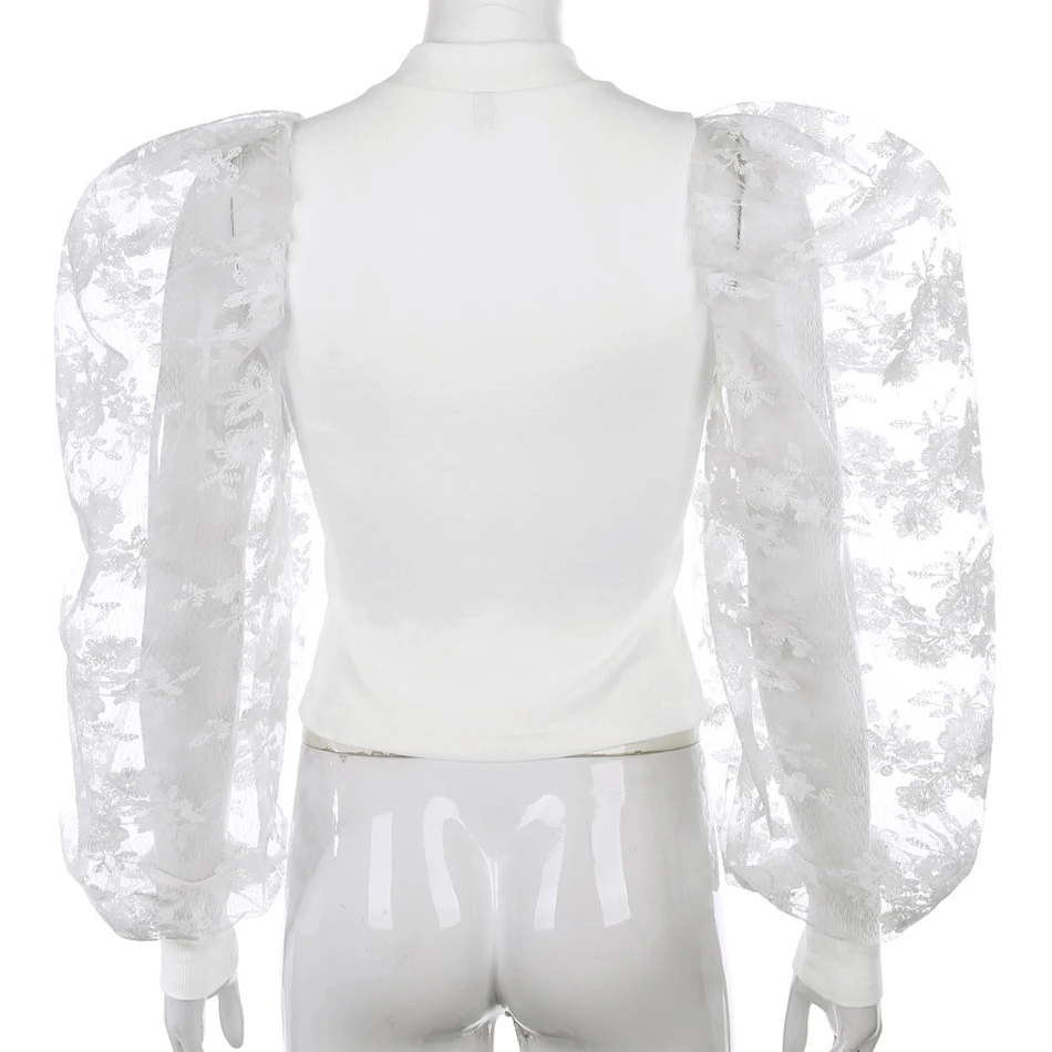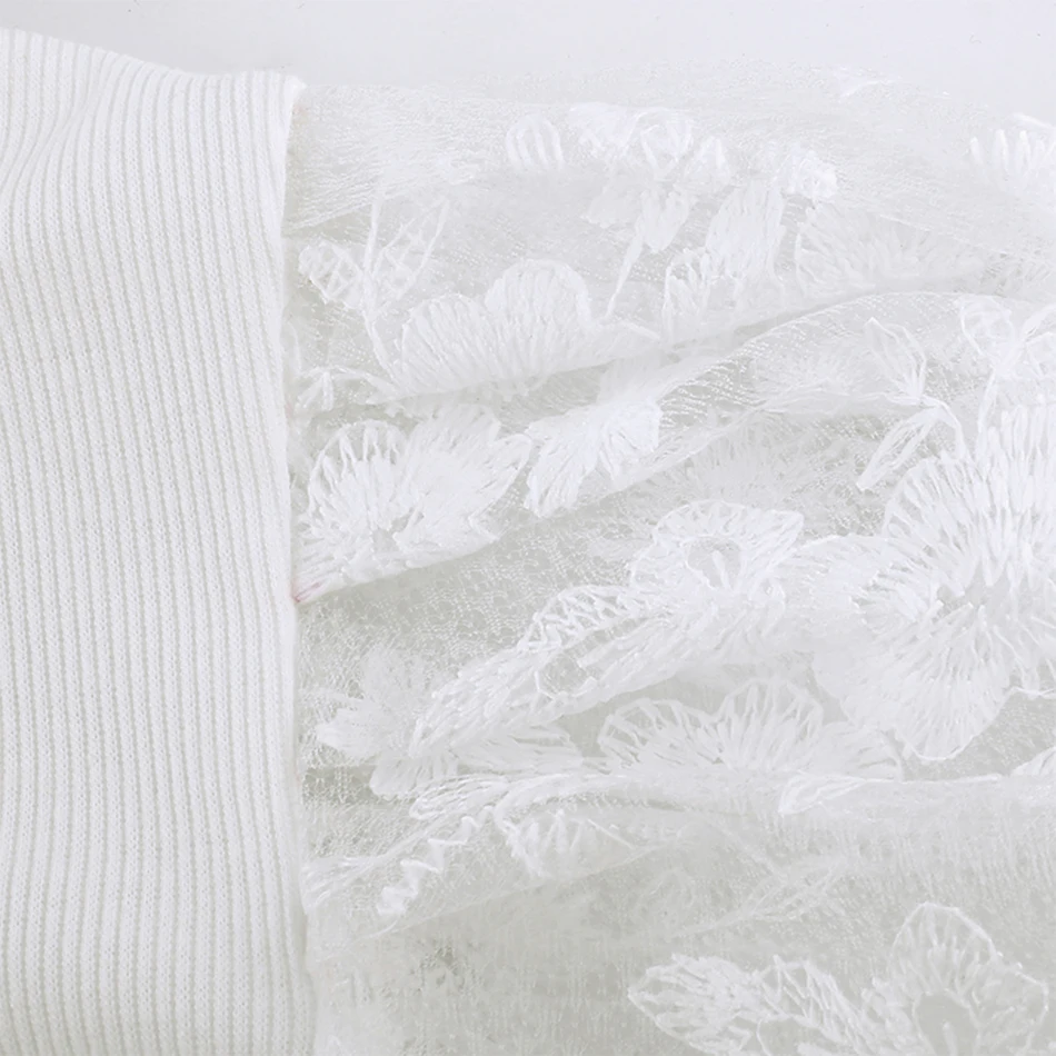 Женский трикотажный топ, с кружевными цветочными рукавами-фонариками, Элегантный Прозрачный сетчатый свитер с высоким воротником, белый джемпер