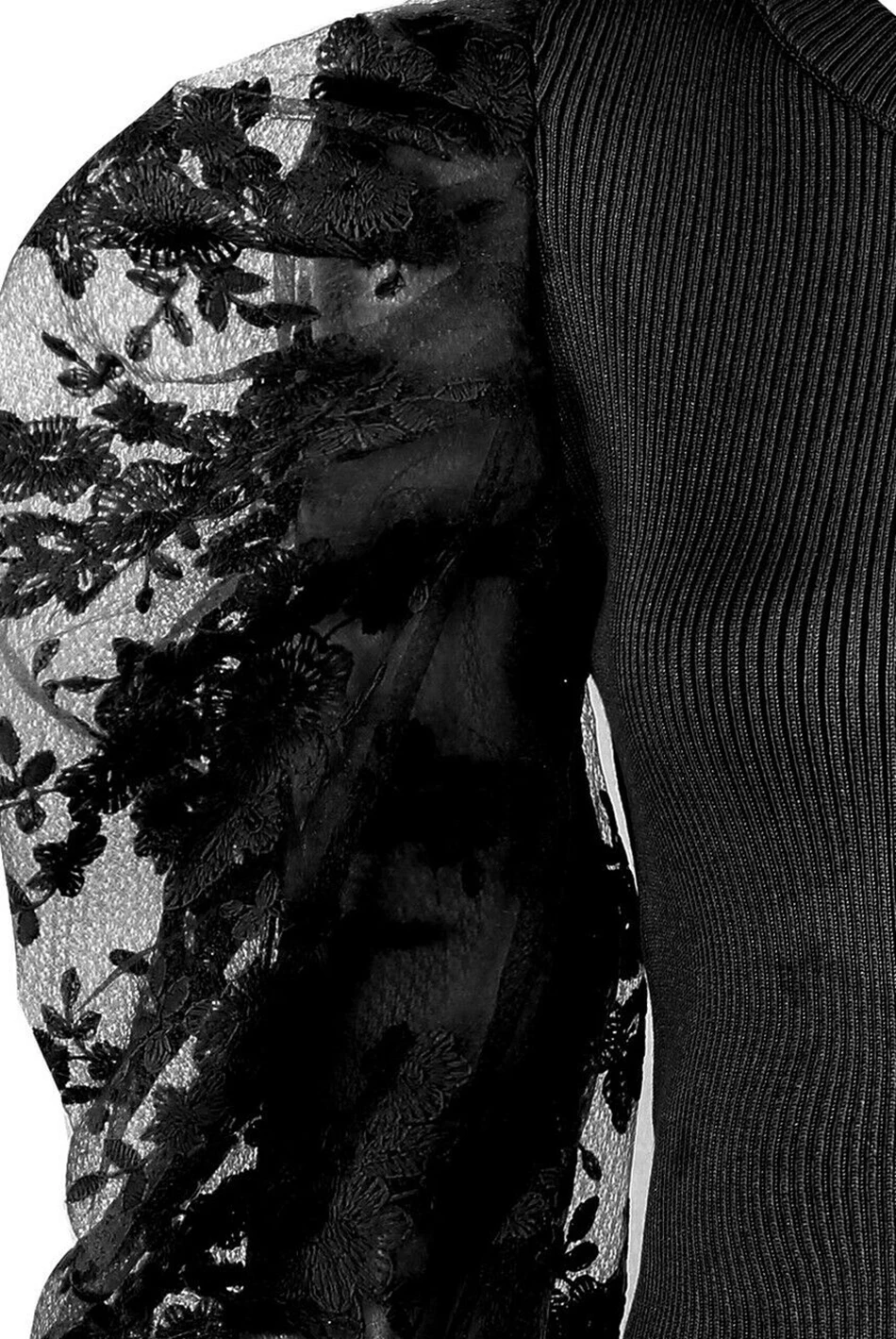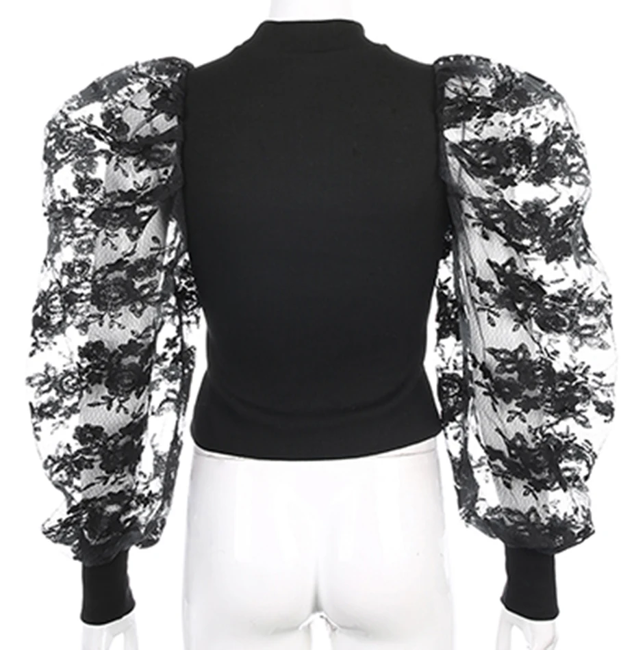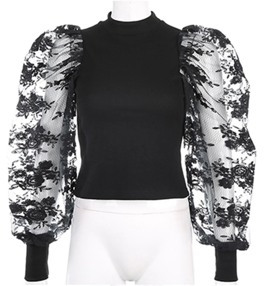 Женский трикотажный топ, с кружевными цветочными рукавами-фонариками, Элегантный Прозрачный сетчатый свитер с высоким воротником, белый джемпер