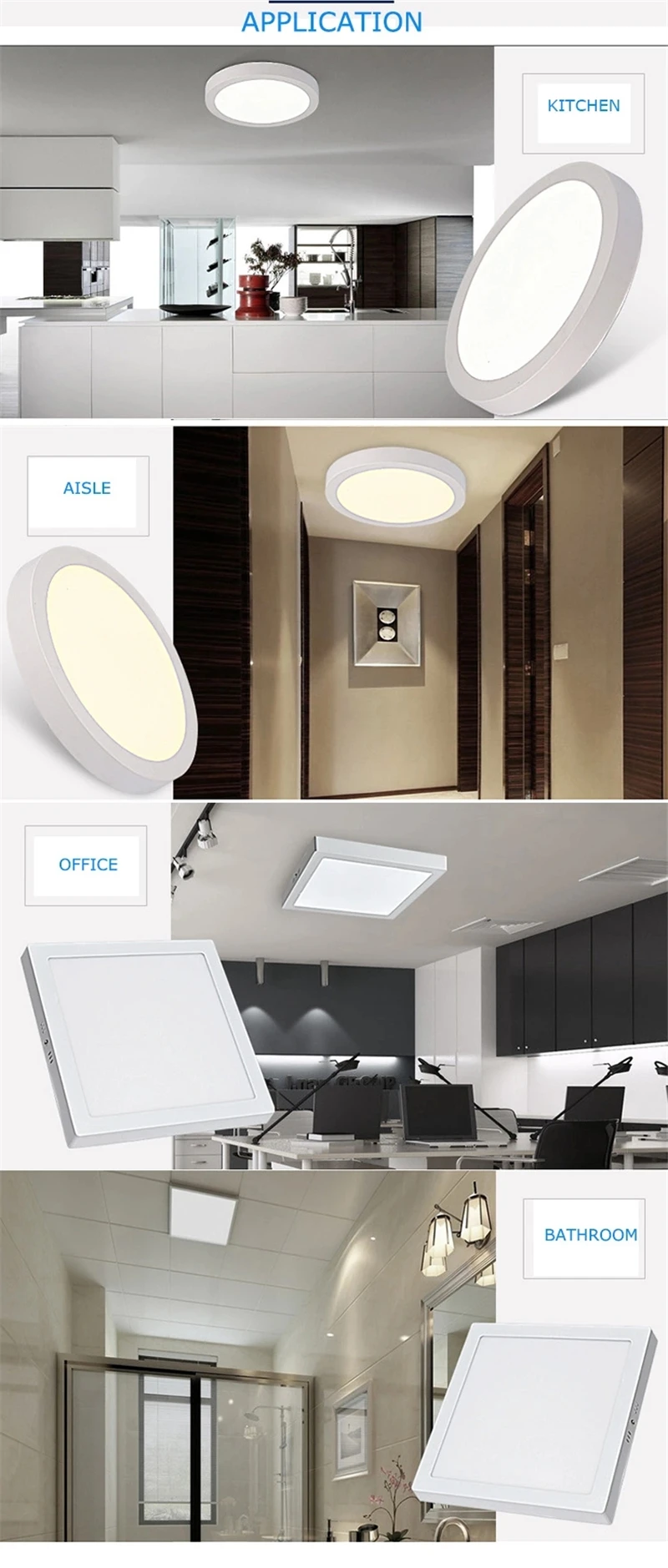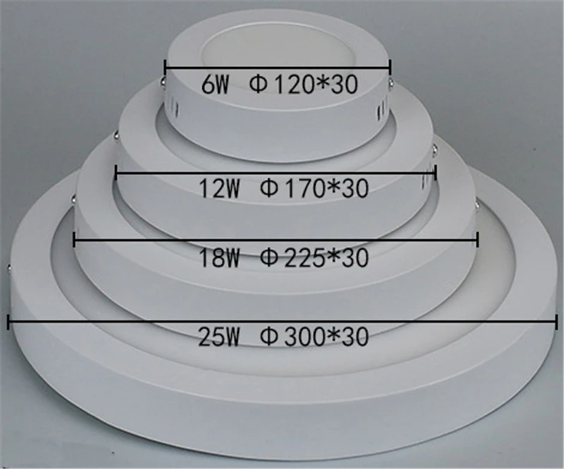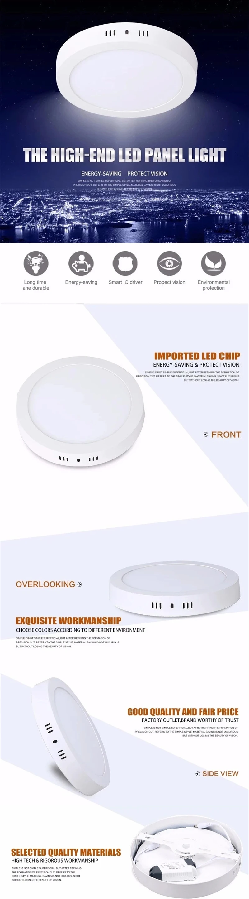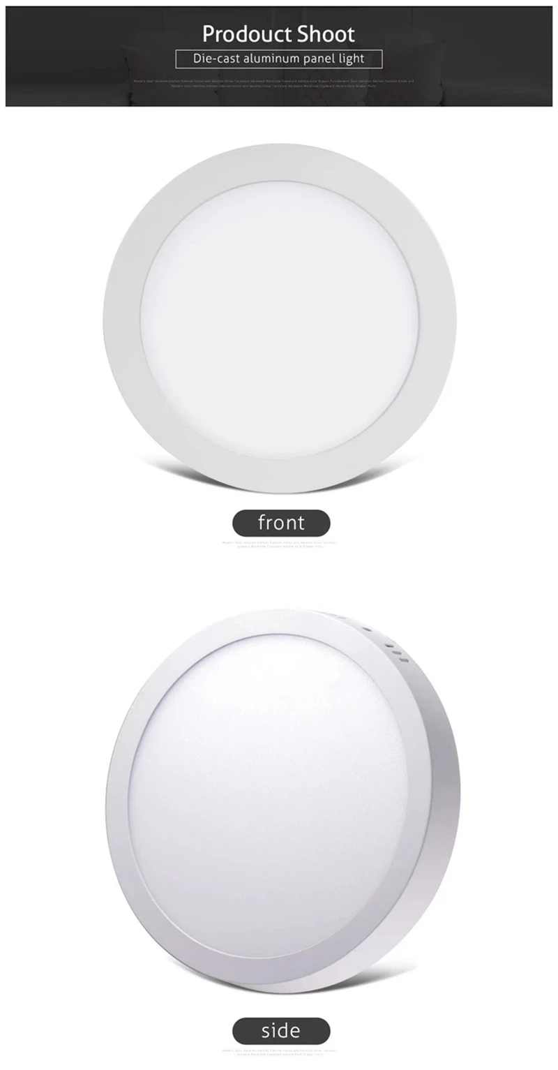 Тип изделия: поверхностные светодиодные панели Мощность: 12 Вт 15 Вт 25 Вт Угол луча (°): 120 ° Входное напряжение: AC85-265V 50-60 Гц Цветовая температура: теплый белый (3000K), холодный белый (6500K) Применение: Дом, отель, ванная комната офисная компания магазин .. и т. Д. Рабочая температура: -40 - 55 °C Коэффициент мощности: ПФ> 97% Срок службы:> 50000 часов Материал корпуса: Алюминий