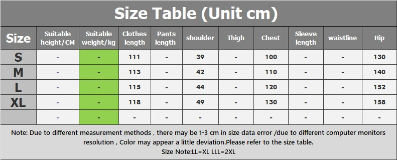 Таблица размеров (единица см) Размер Подходящая высота/см Подходящий вес/кг Длина одежды Длина брюк Плечо Бедра Грудь Длина рукава Линия талии Нижнее отверстие М - - 104 - 37 - 94 - - 118 XL - - 111 - 41 - 110 - - 136 XХХL - - 112 - 42 - 126 - - 146 - - - - - - - - - - Примечание: Из-за различных методов измерения возможна погрешность в размере 1-3 см/из-за различий в разрешении компьютерных мониторов цвет может немного отличаться. Пожалуйста, обратитесь к таблице размеров.Примечание по размеру: LL = XL LLL = 2XL