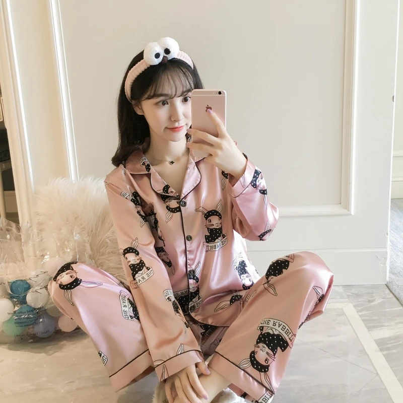 Пижама женская атласная, с длинным рукавом, Осень-зима, 2 шт.